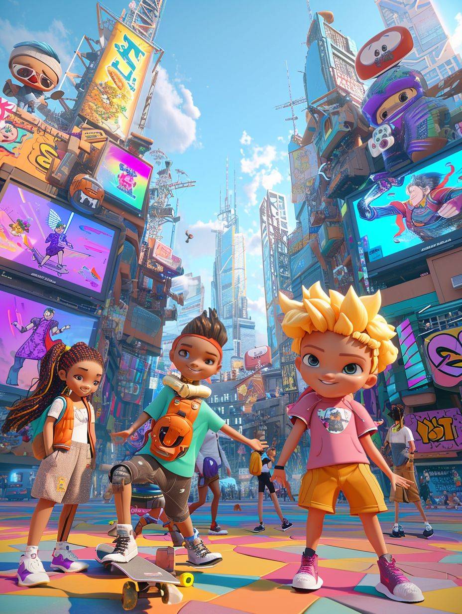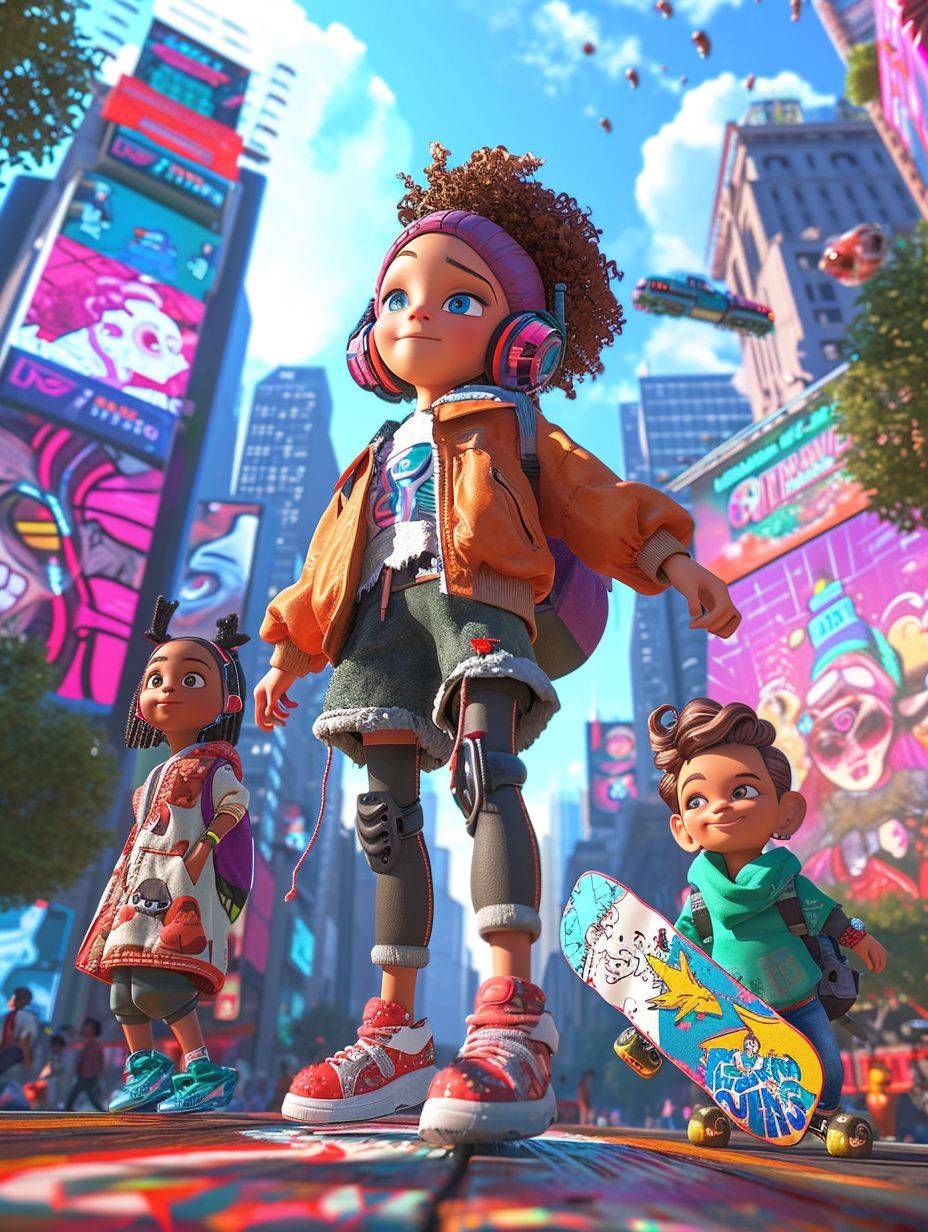 A lively and captivating CG cartoon scene showcasing modern character IPs in a bustling urban setting. Picture a group of diverse, adorable characters, each with their own unique style and personality, gathered in a vibrant city park. Among them, a tech-savvy girl with futuristic gadgets, a charismatic boy with a skateboard, and a creative artist painting a mural. The background is a lively cityscape with skyscrapers, digital billboards, and neon lights. The atmosphere is energetic and trendy, highlighting each character's distinctiveness and the dynamic nature of contemporary life. --ar 3:4 --style raw --v 6