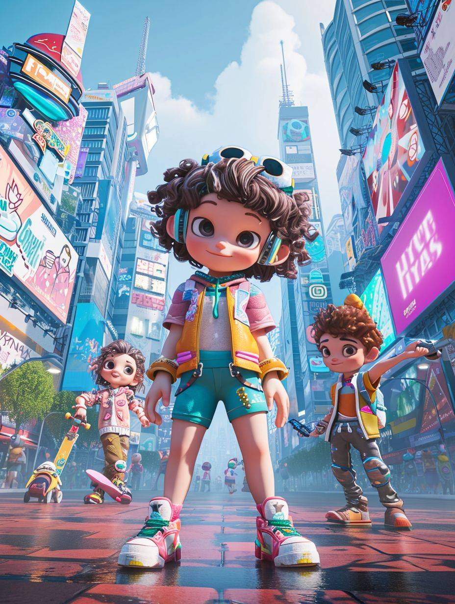 一個生動迷人的CG卡通場景,展示了現代角色IP在繁忙都市環境中的活動。畫面中一群多樣化、可愛的角色,各具獨特風格和個性,他們聚集在一個充滿活力的城市公園裡。角色中有一位擅長科技的女孩,手持未來主義的小工具,有一位騎滑板的有魅力男孩,還有一位正在塗鴉壁畫的創意藝術家。背景是一幅生機勃勃的城市風景,有摩天大樓、數位廣告牌和霓虹燈。氣氛充滿活力和時尚,突顯了每個角色的獨特性和當代生活的動態特性。