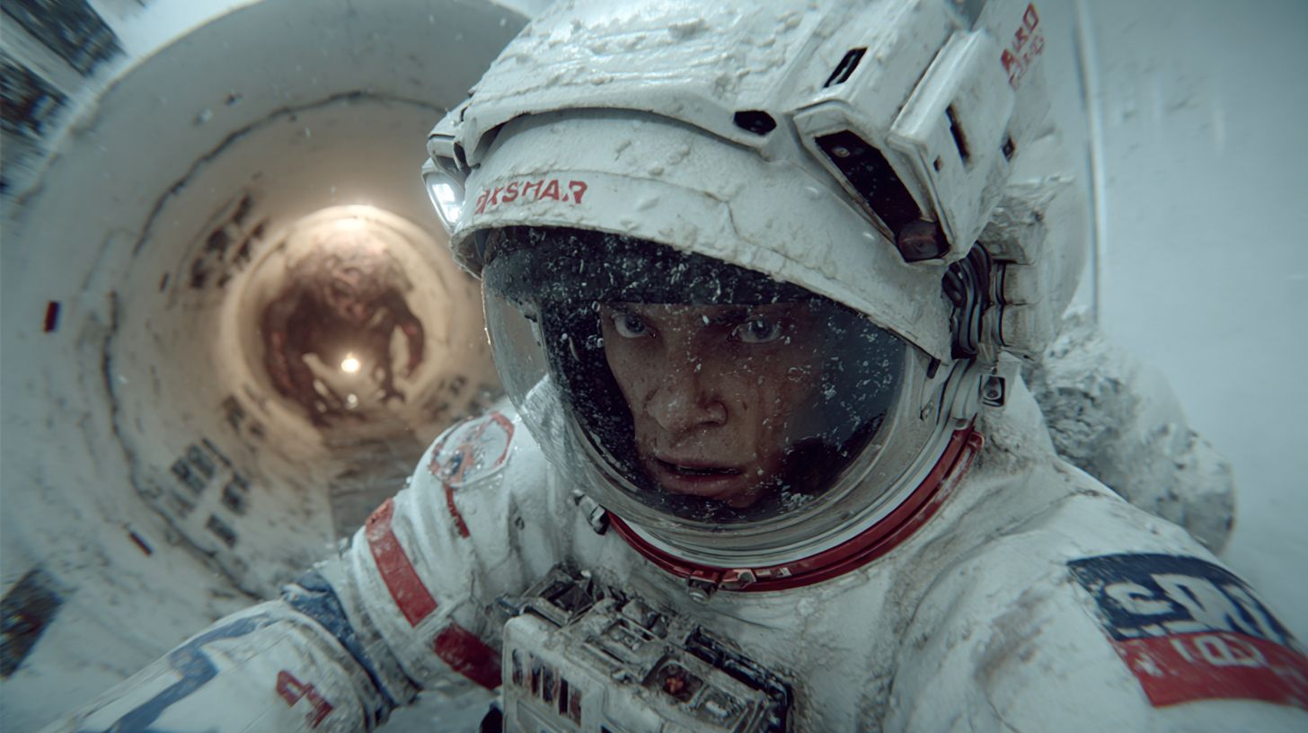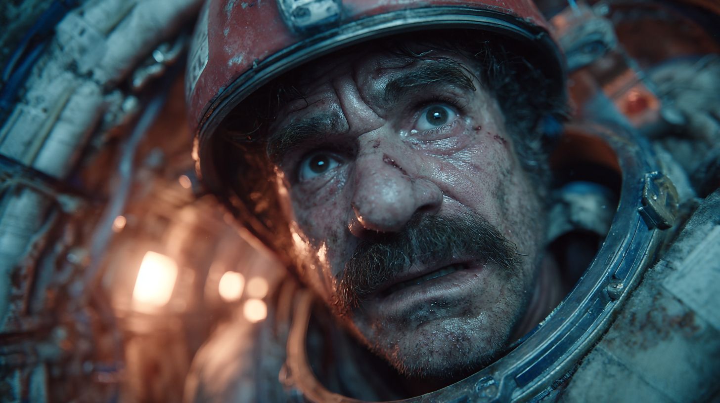 魯伊吉穿着太空服,進入伊西穆拉國際空間站,手持手電筒轉過一條黑暗的走廊。身後牆壁上投射出可怕的死靈怪影,正向前衝來。魯伊吉的臉上滿是恐懼,展現出復古科幻恐怖的氛圍,細節豐富,光影戲劇化,8K分辨率,宛如生存恐怖遊戲中的電影畫面。
