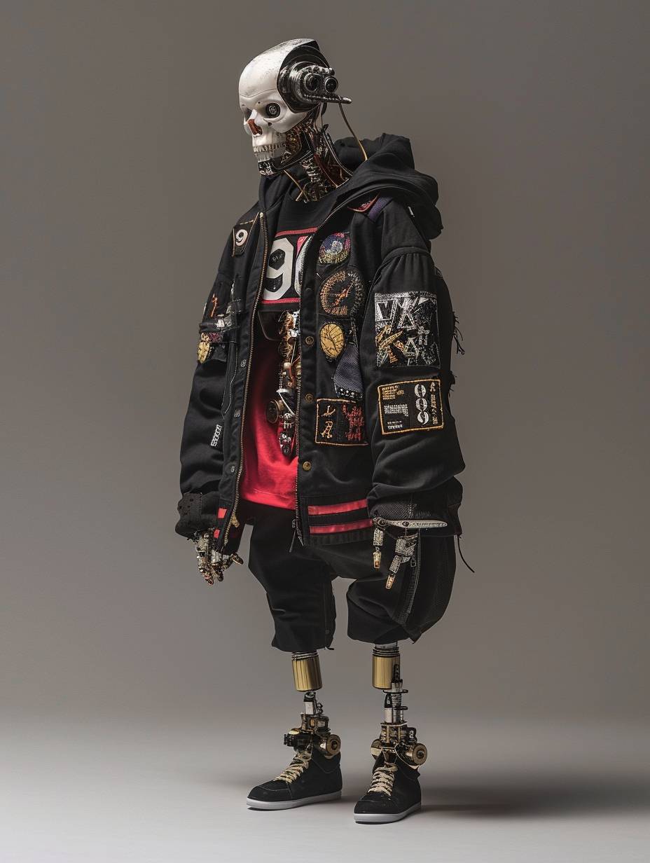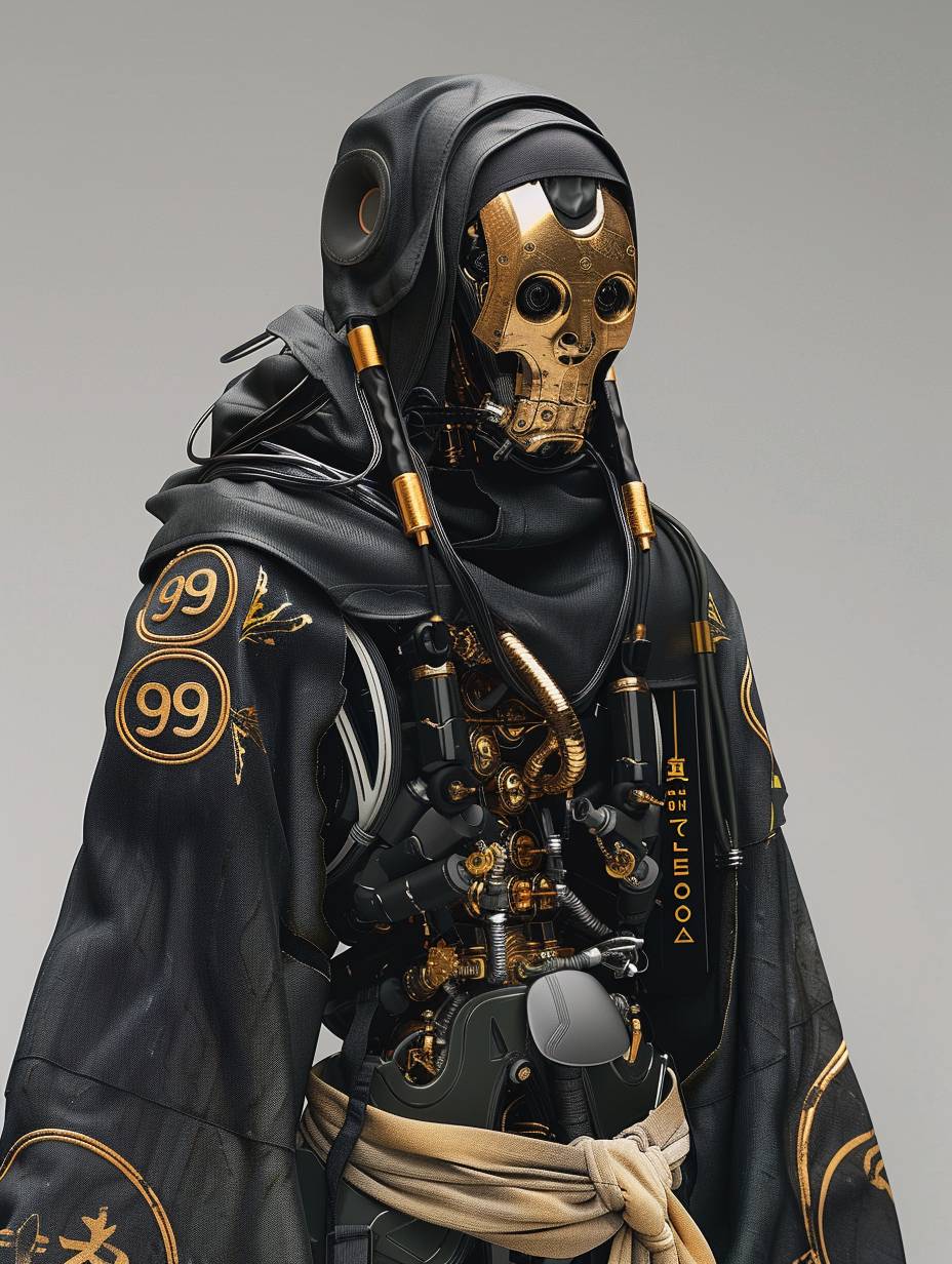 這個角色是一個融合了人類與機器人特徵的異域生物,擁有金屬骨骼結構和多色啞光塗層,穿著像和尚風格的新亞洲服裝,身上有黑色金線刺繡補丁,數字「99」被多個補丁裝飾。