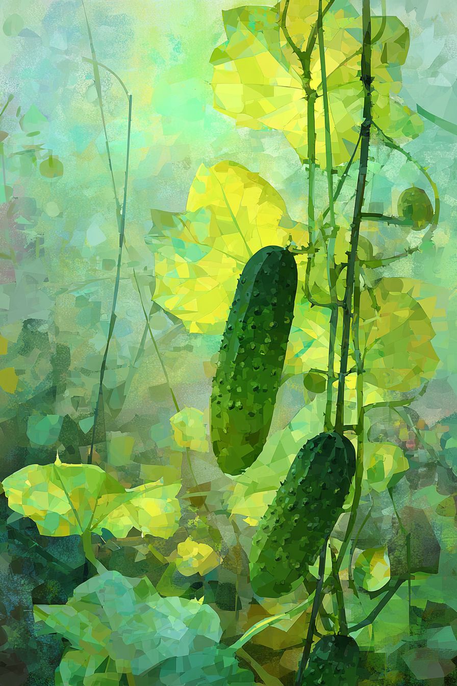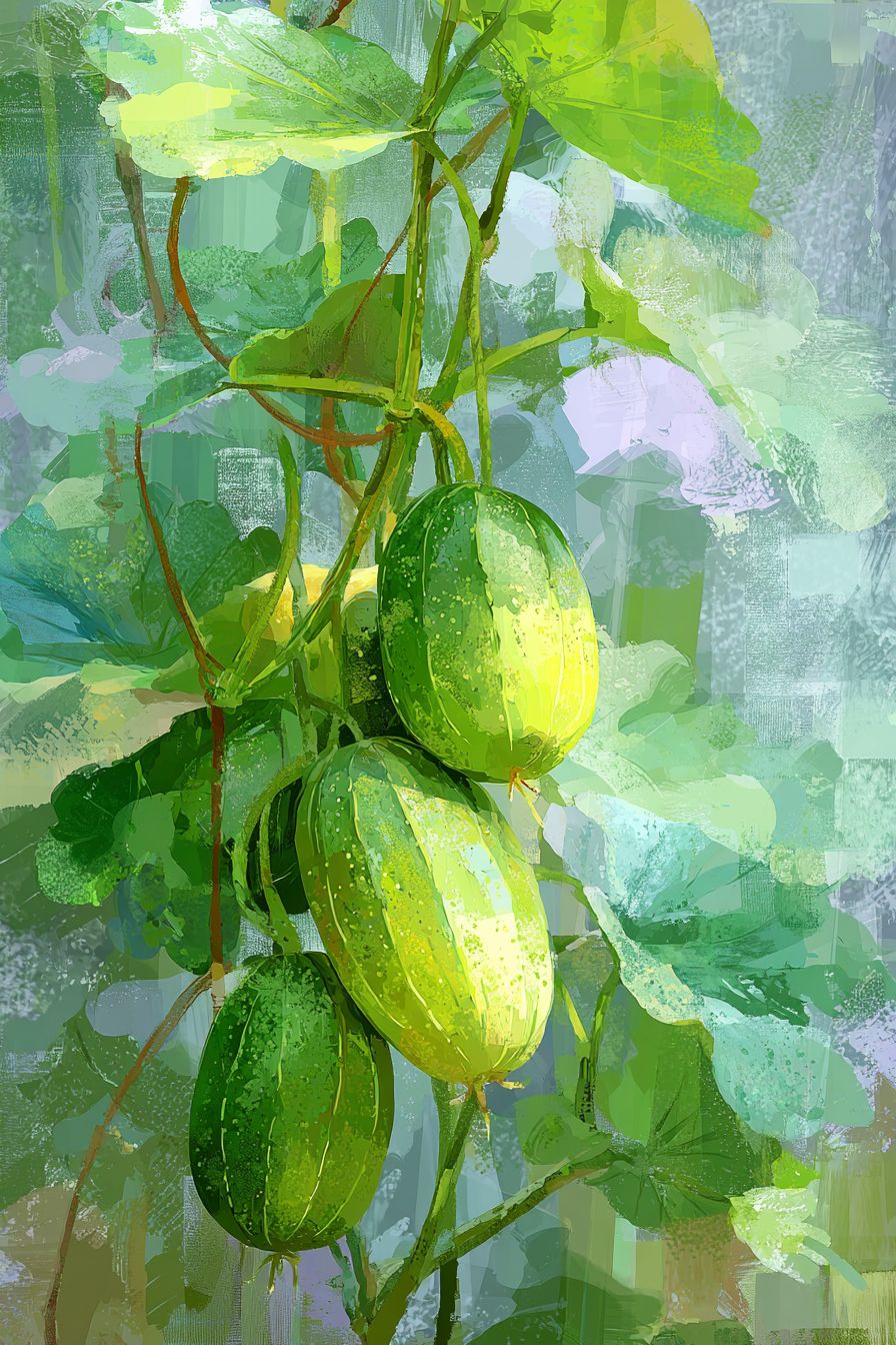 黃瓜棚,小蟋蟀,淺黃色和淺綠色,高貴而冷淡,意識流,朦朧,迷幻,孤獨的世界,大面積的空白空間,散射漸變,圖片中的碎片化顏色,層次感,水粉,深度和夢幻效果,明顯的霜狀顆粒質感,厚重的色塊筆觸,明亮的顏色,明暗對比,光暈,混合,散射漸變,高端感,優雅,浪漫主義,水粉藝術插圖,夢幻,敘事,設計感,圖片中的顏色拼貼,敦煌畫風。