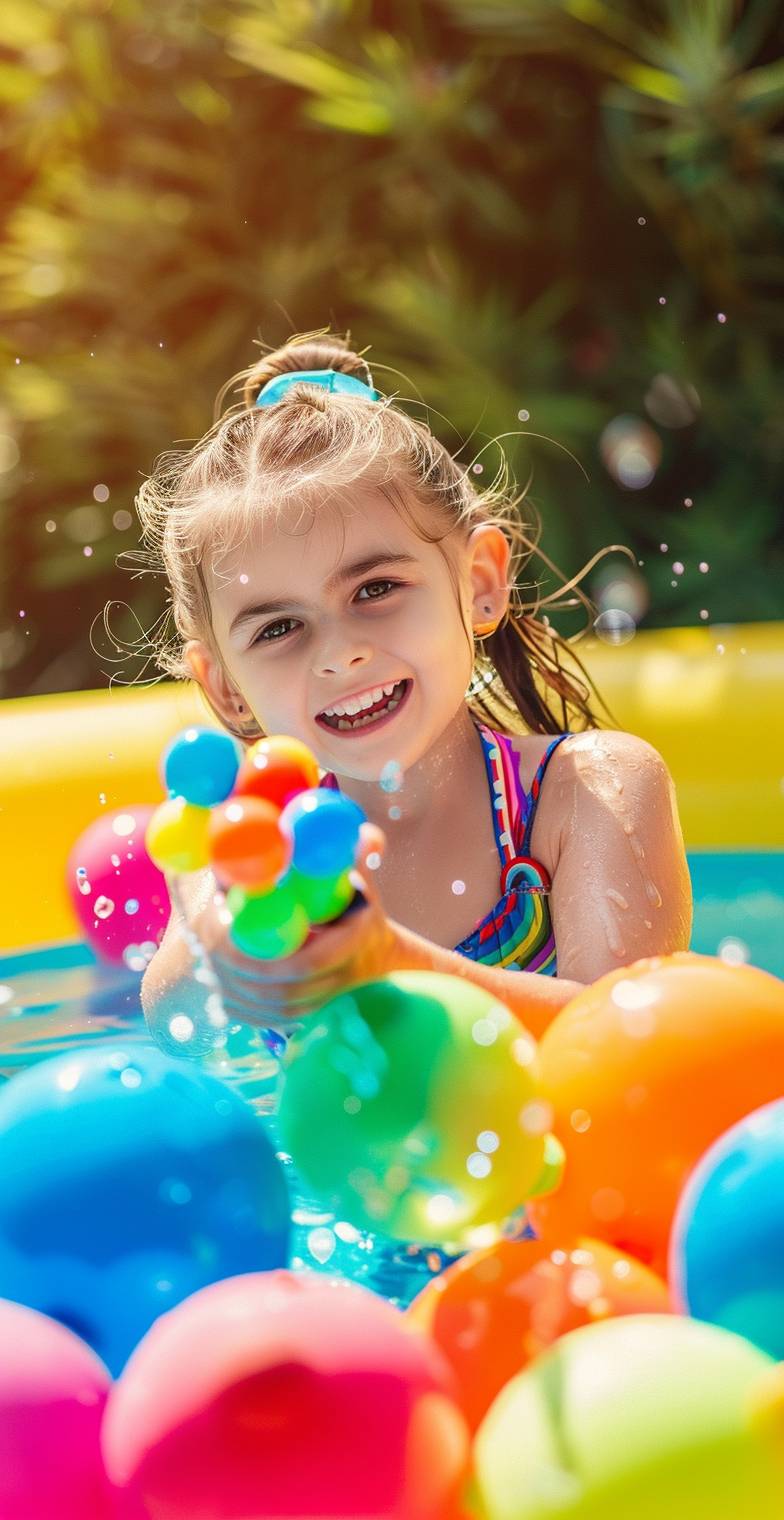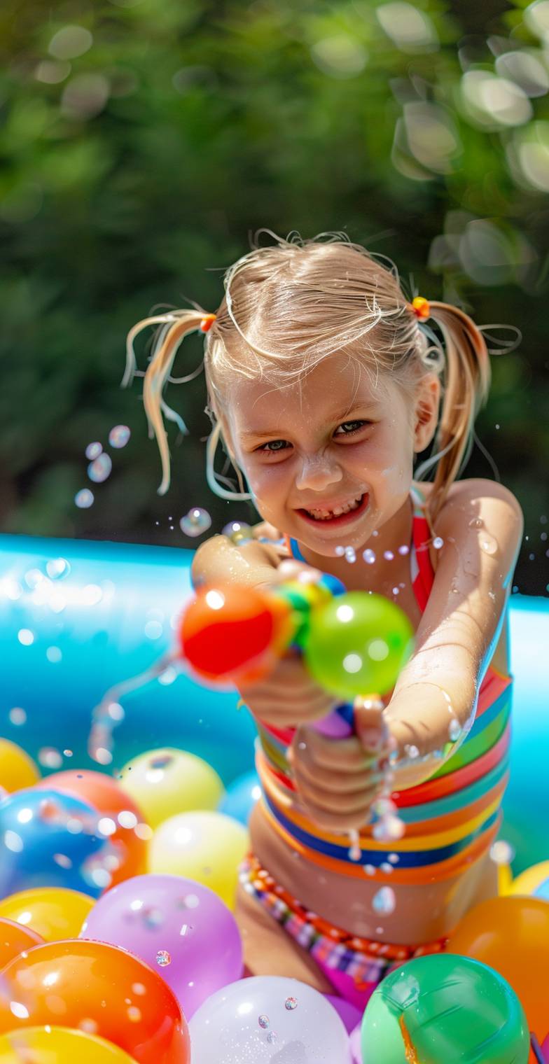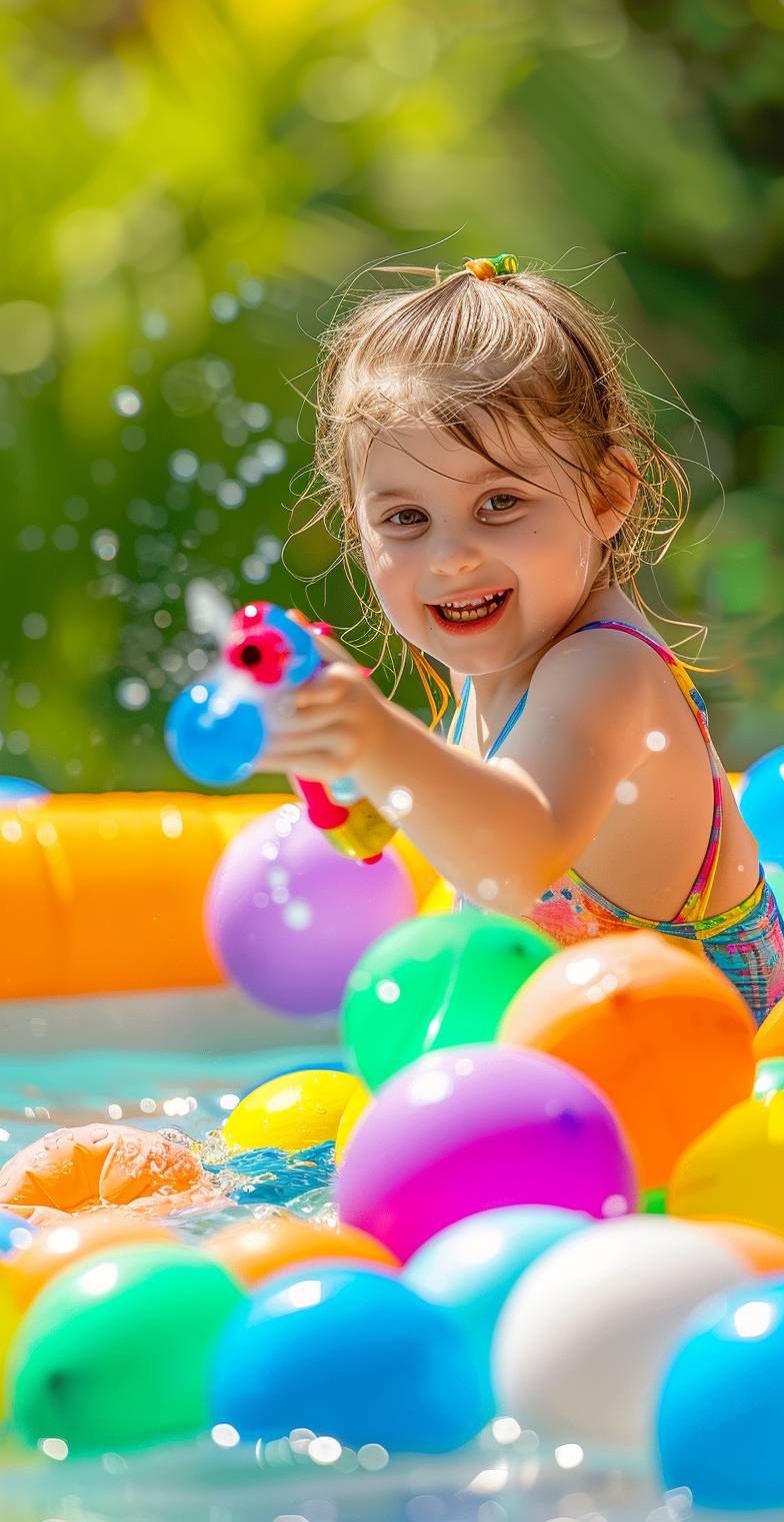 一個可愛的小女孩穿著泳衣,手持水槍,向充滿五顏六色氣球的充氣泳池射出彩色球,背景是一個夏季花園,她面帶快樂的表情,沐浴在自然光中,畫面風格專業攝影,聚焦清晰,分辨率高,質量優良。