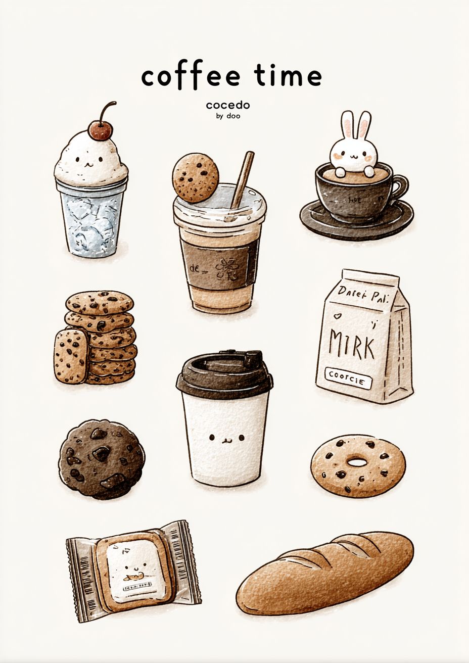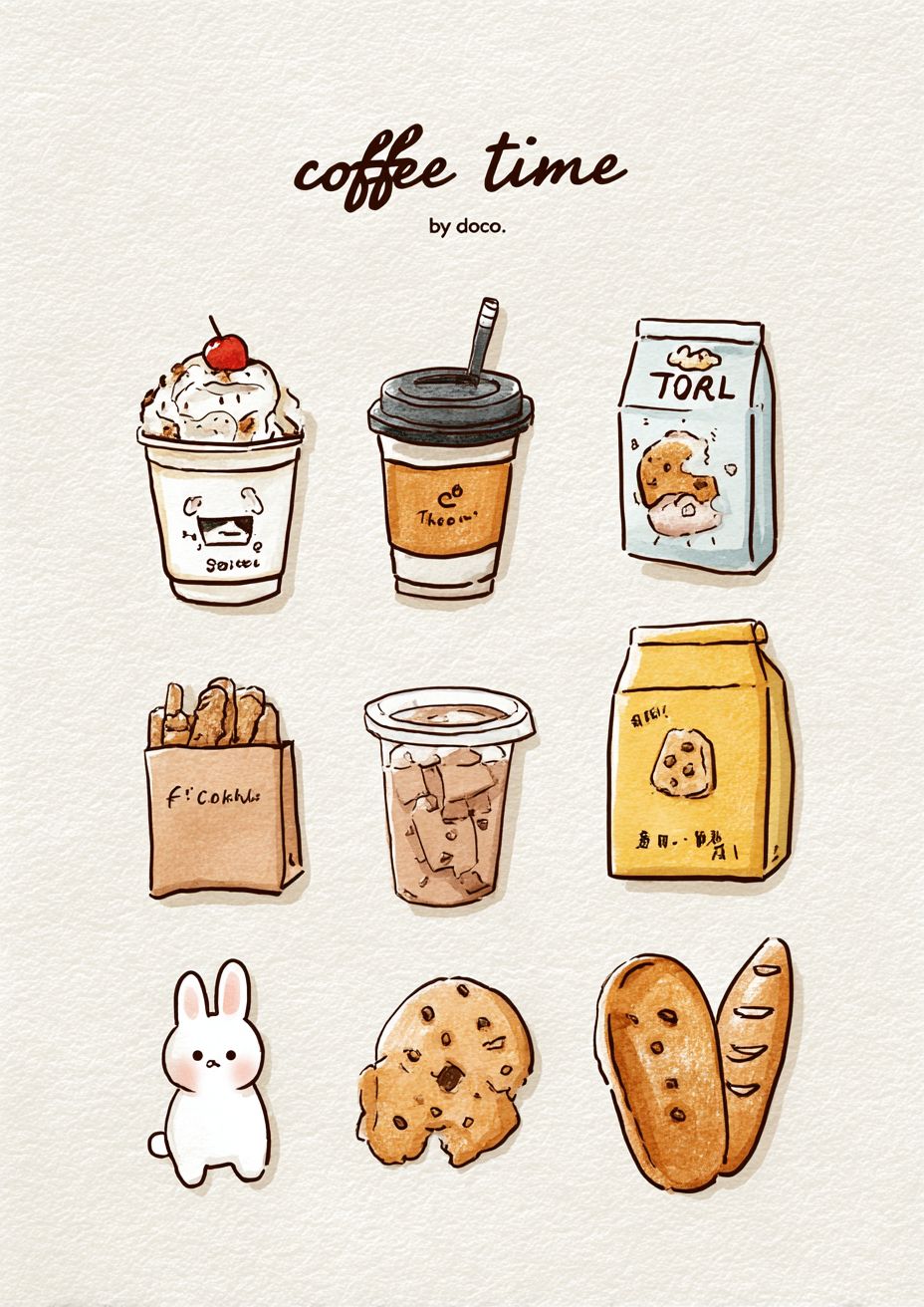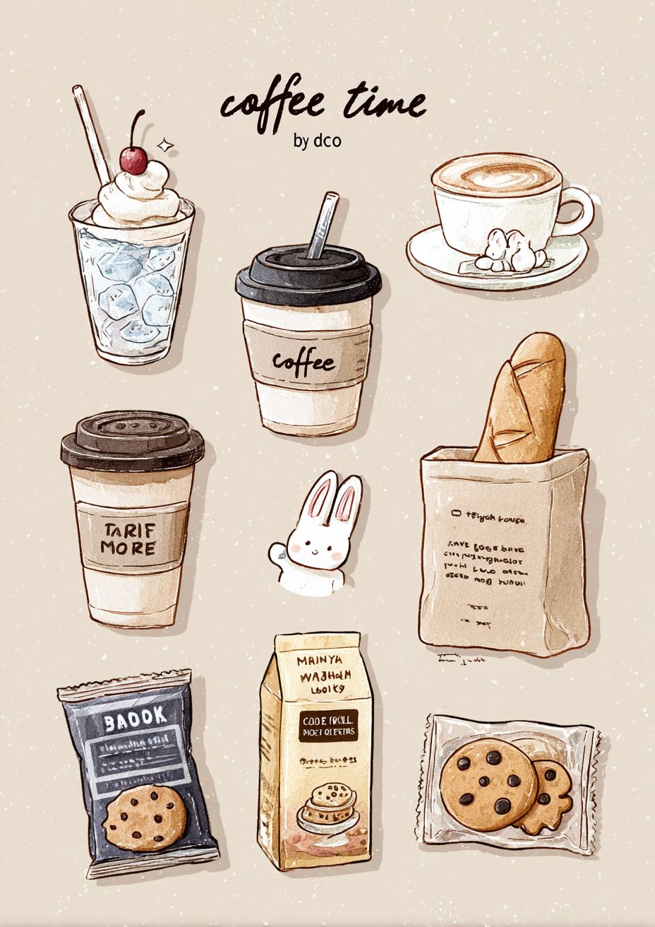 a collection of cute hand - drawn illustrations themed around coffee time. at the top, the text "coffee time" and "by cdco." is displayed. the illustrations include a cup of ice - cream with a cherry and a bunny figurine, a coffee cup with a cookie on the straw, a carton of milk, a tote bag with french text, a chocolate chip cookie, a pack of butter cookies, and a baguette. there are also hand - the overall style is simple, with a water - color touch and a cozy, inviting atmosphere. --ar 5:7 --v 7.0