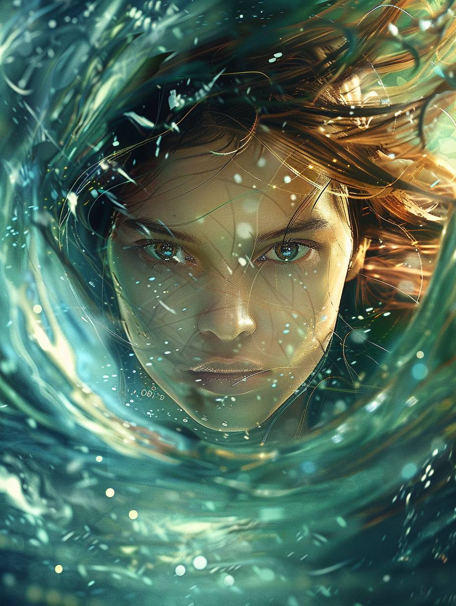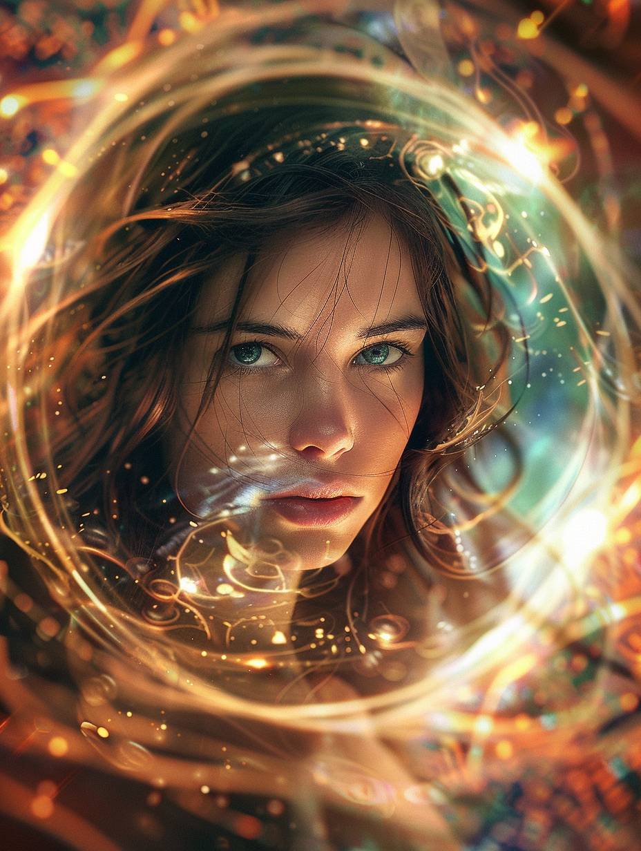 一名美麗的棕髮女孩被能量螺旋包圍,充滿魔幻氣氛和色彩繽紛的背景。