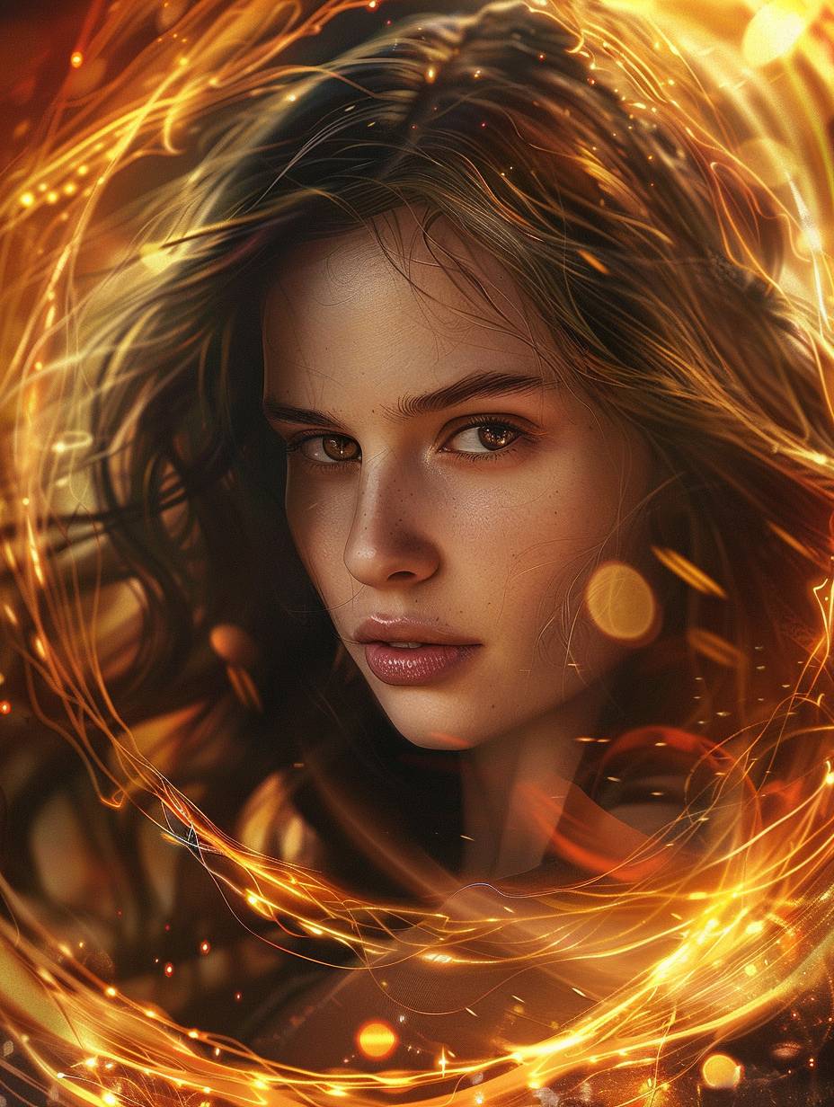 A beautiful girl with brown hair is surrounded by an energy spiral, in the style of fantasy, in a fantasy world, with magic light effects, in the digital art style, hyperrealistic, high resolution, very detailed, vibrant colors, a colorful background, a dynamic pose, sharp focus, in the style of portrait photography, a symmetrical composition, a magical atmosphere. --ar 3:4 --v 6.0