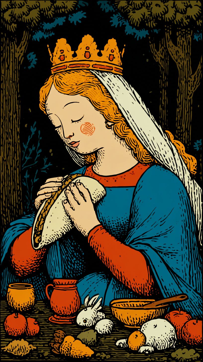 Burrito is a divine food. A medieval painting of burrito that shows its powerful holy importance --ar 9:16 --sref 2842156653 --s 750 --raw