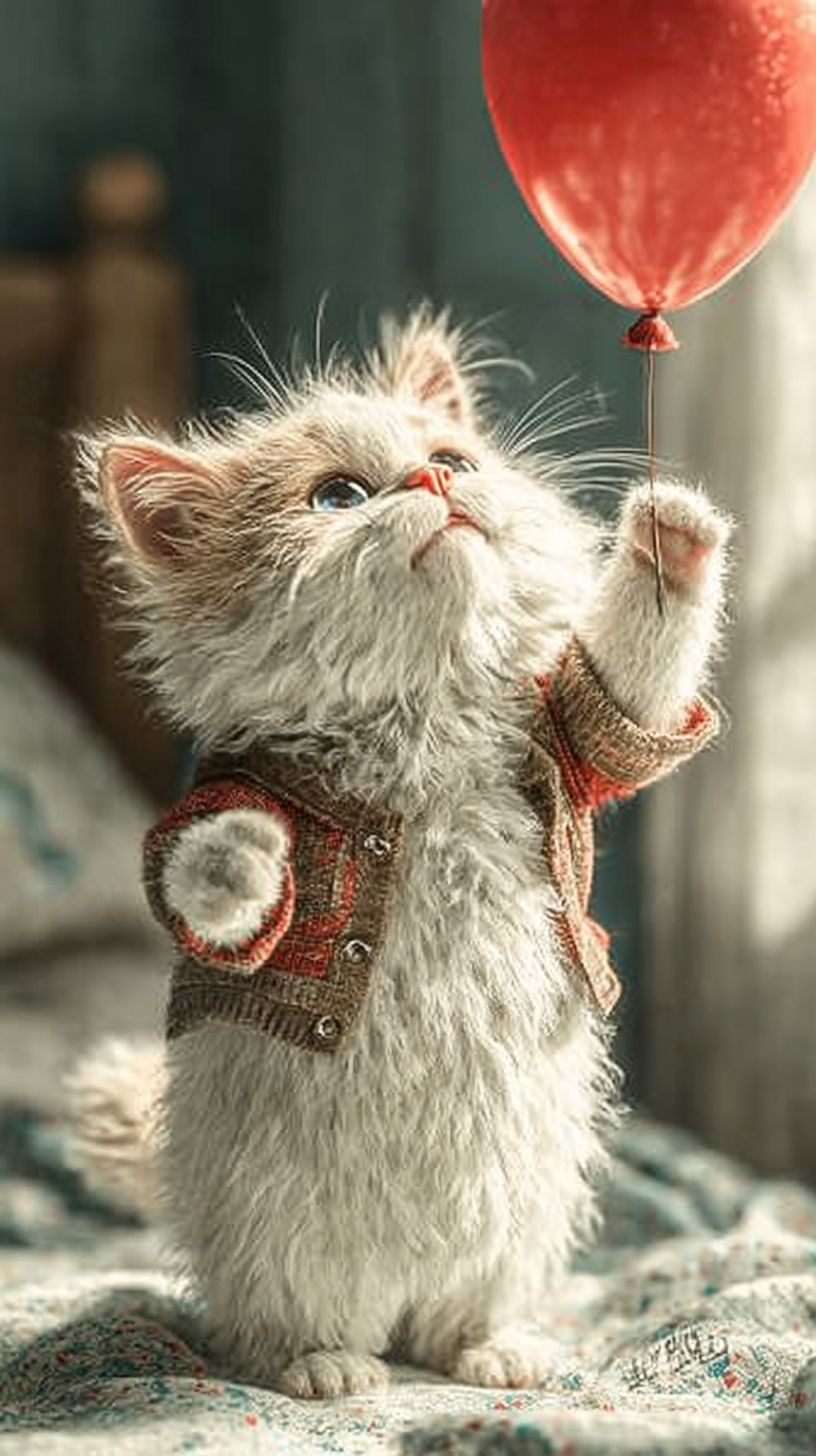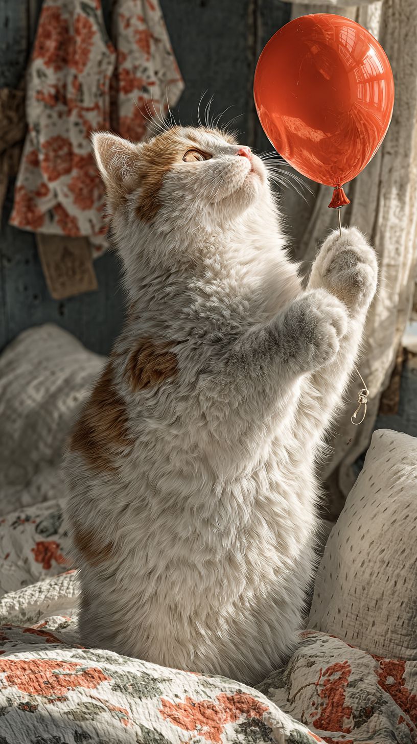 photorealistic fluffy white chubby cat on hind legs tapping a red helium balloon, balloon floating just above its head, diffused afternoon light, cozy bedroom --ar 9:16 --s 750