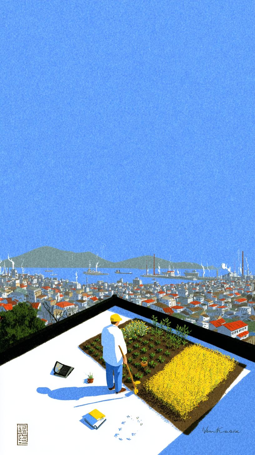 一名男子在屋頂花園照顧植物,旁邊放著關閉的筆記本電腦和打開的日記,夕陽洒下,穿著簡單,背後是繁忙的城市工業,散發著慢慢獲得經濟獨立的氛圍