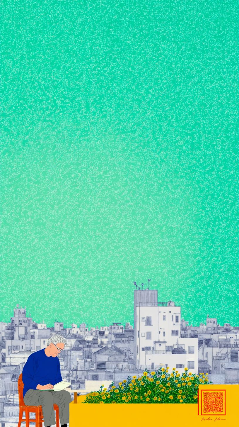 極簡風格的竹政良,一名男子在小型屋頂花園中照料植物,旁邊關閉的筆記本電腦,翻開的日記本,夕陽的光線。簡單的服裝,男子背後是繁忙城市工業的景色,柔和的粉彩色調,散發著緩慢的財務獨立氣息。