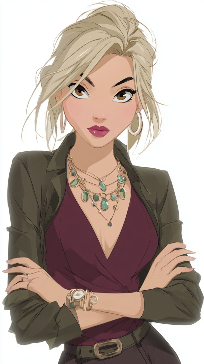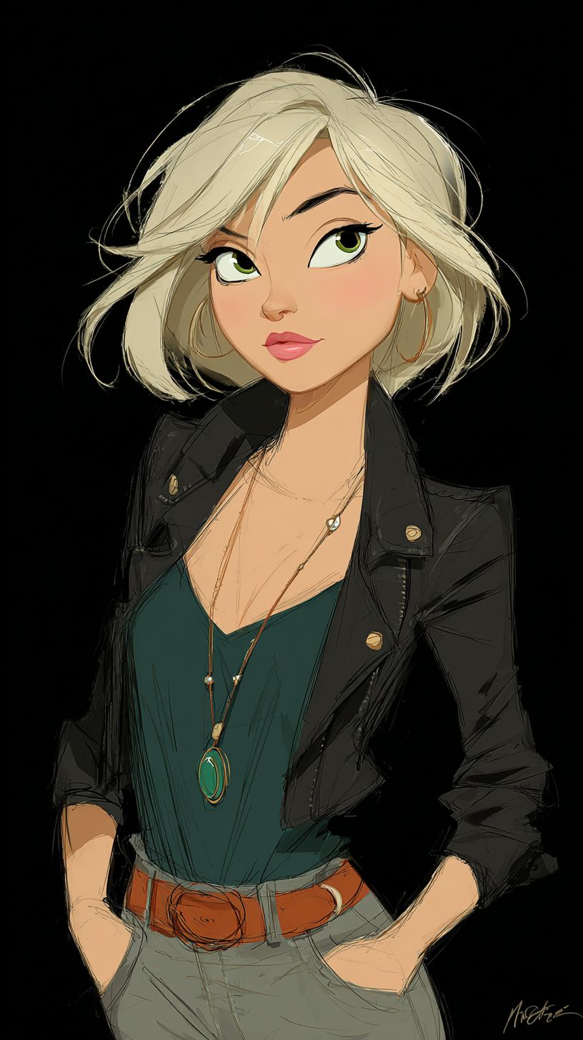 create the character in cartoon style: Hailey Age: Around 22-24 years old Race: Caucasian Skin Tone: Fair skin, carefully maintained Height: Approximately 168 cm, Short Hair Color: Dyed a trendy blonde or flaxen shade Eye Color: Light brown, often carrying a look of jealousy and scheming, Personality: Ambitious, extremely jealous, vain, malicious, and ruthless. Lacking real talent, she relies on plagiarism and suppressing others to satisfy her desires. Though she appears glamorous on the outside, she harbors deep insecurity and darkness within. Show the full body with clothing. --ar 9:16 --s 750