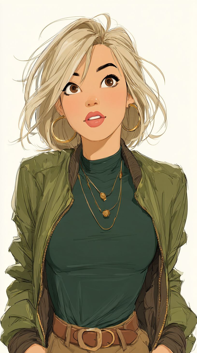 創建一個卡通風格的角色:海莉,年齡約22-24歲,種族:白人,膚色:白皙,細心保養,身高:約168厘米,短髮顏色:染成時尚的金色或亞麻色,眼睛顏色:淺棕色,常常帶有嫉妒和陰謀的神情,個性:雄心勃勃,極度嫉妒,虛榮,惡意,冷酷。缺乏真正的才華,她依賴剽竊和壓制他人來滿足自己的欲望。儘管外表光鮮亮麗,但內心懷有深刻的不安全感和黑暗。展示全身著裝。