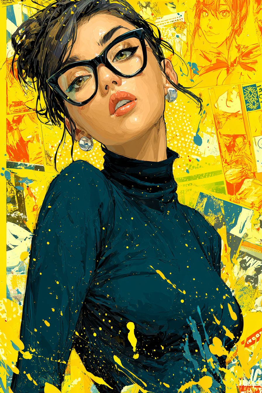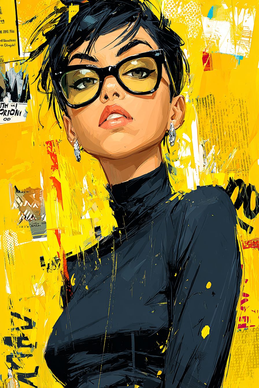 A full-body fashion illustration of a short-haired female character wearing bold black-framed glasses, a sleek black turtleneck, and silver stud earrings, creating a cool-toned aesthetic. Set against a vibrant yellow background for striking contrast, with intricate brushstrokes capturing glossy skin texture. The character exudes confidence through a piercing gaze, breaking out of a comic panel with dynamic lines and a bold, avant-garde pose. Blending pop art vibrancy with street culture elements. --ar 2:3 --s 750