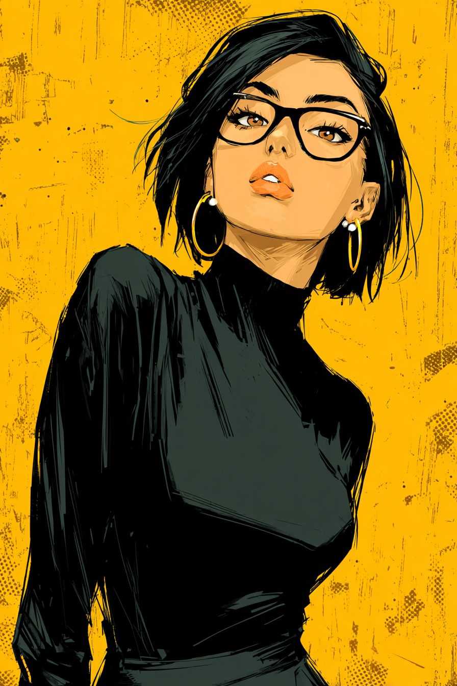 一幅全身時尚插圖,描繪了一位短髮女性角色,佩戴著大膽的黑框眼鏡,穿著簡潔的黑色高領衫,耳環是銀色的扣式耳環,展現出酷炫的色調美感。背景是生動的黃色,形成鮮明的對比,複雜的筆觸捕捉到光滑的皮膚質感。角色通過銳利的目光散發出自信,突破漫畫面板,呈現出動感的線條和大膽的前衛姿勢。融合了流行藝術的活力與街頭文化元素。