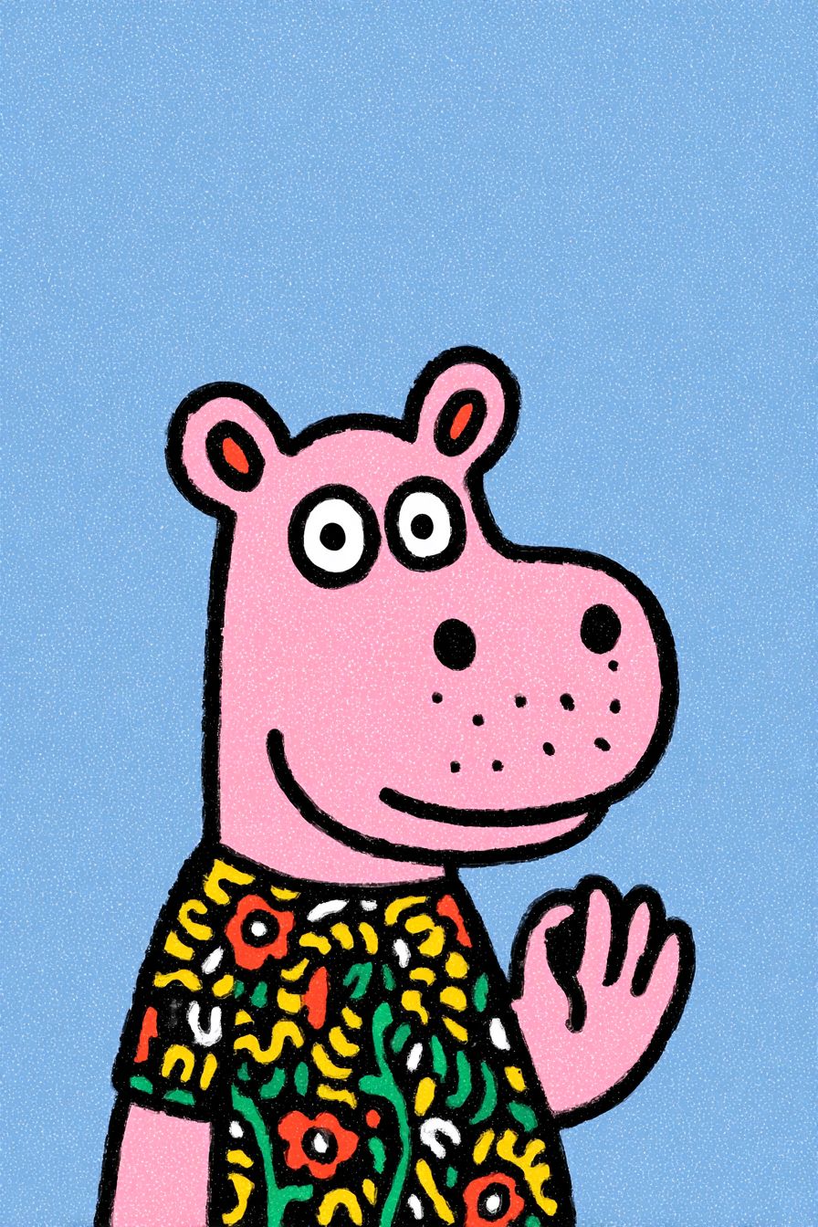 一隻小眼睛和厚嘴唇的河馬,看起來非常疲憊,身體的一半從畫面的左側凸出。它的左手做著“OK”的手勢。乾淨的淺色背景。