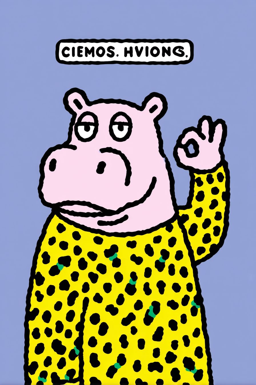 A Hippos with small eyes and thick lips, looking very tired, with half of its body protruding from the left side of the picture. Its left hand is making the "OK" gesture.clean light background, --chaos 10 --ar 2:3 --exp 80 --sref 7166002 --profile 29poq4o --s 750