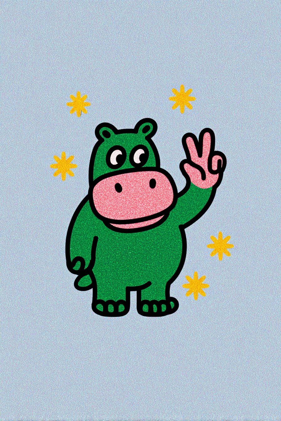 一隻小眼睛和厚嘴唇的河馬,看起來很疲倦,身體的一半從畫面的左側突出,左手做著“OK”手勢