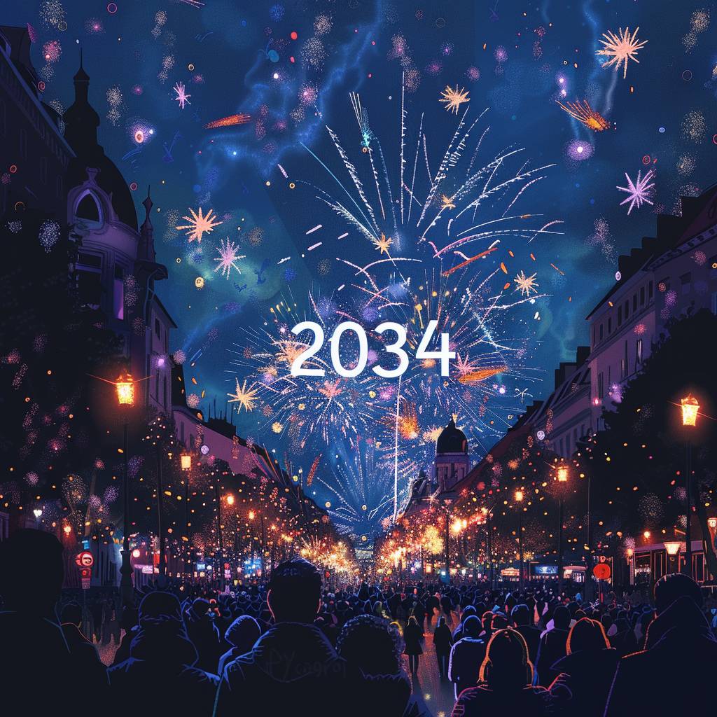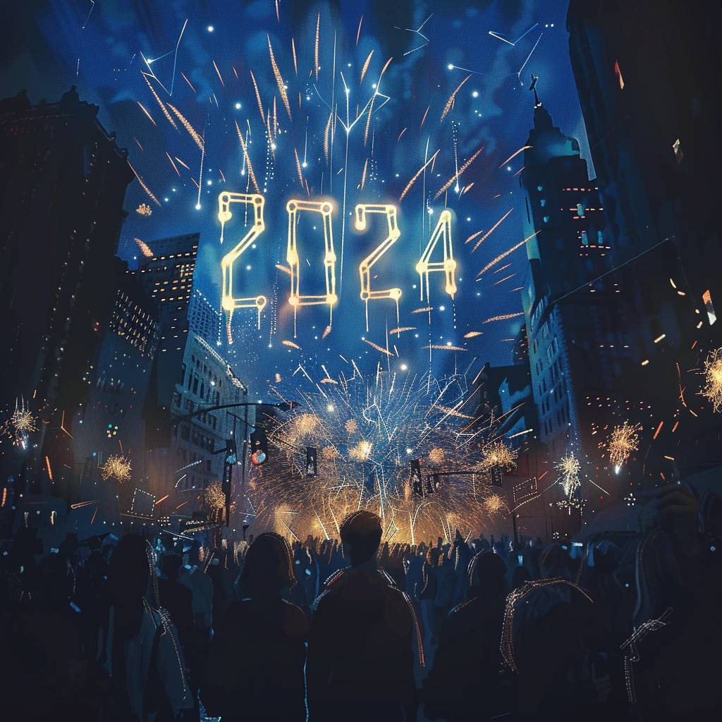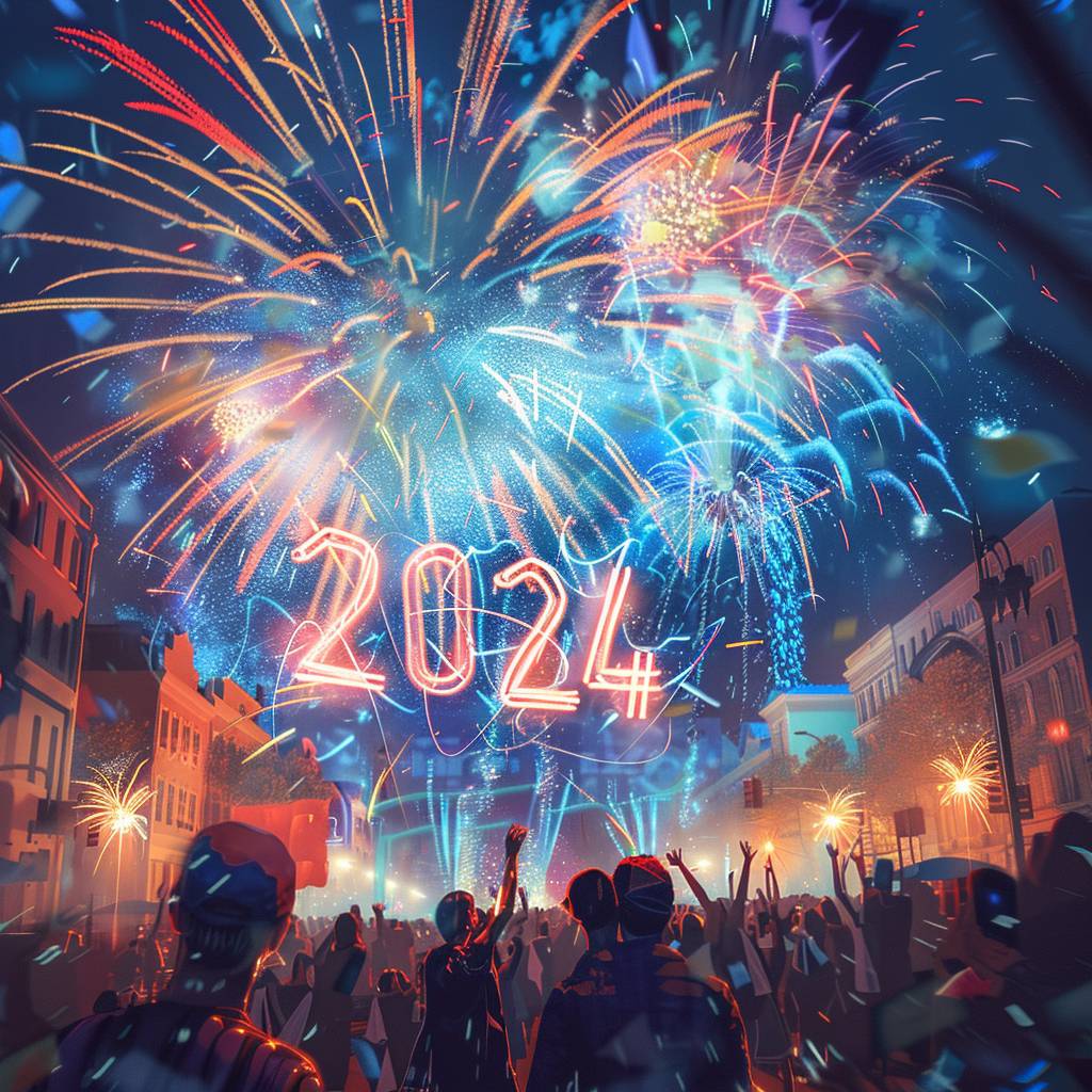 Fireworks dispersing into the shape of "2024" in the night sky,a azure night sky,celebratory crowd in the streets,cartoon style --v 6.0