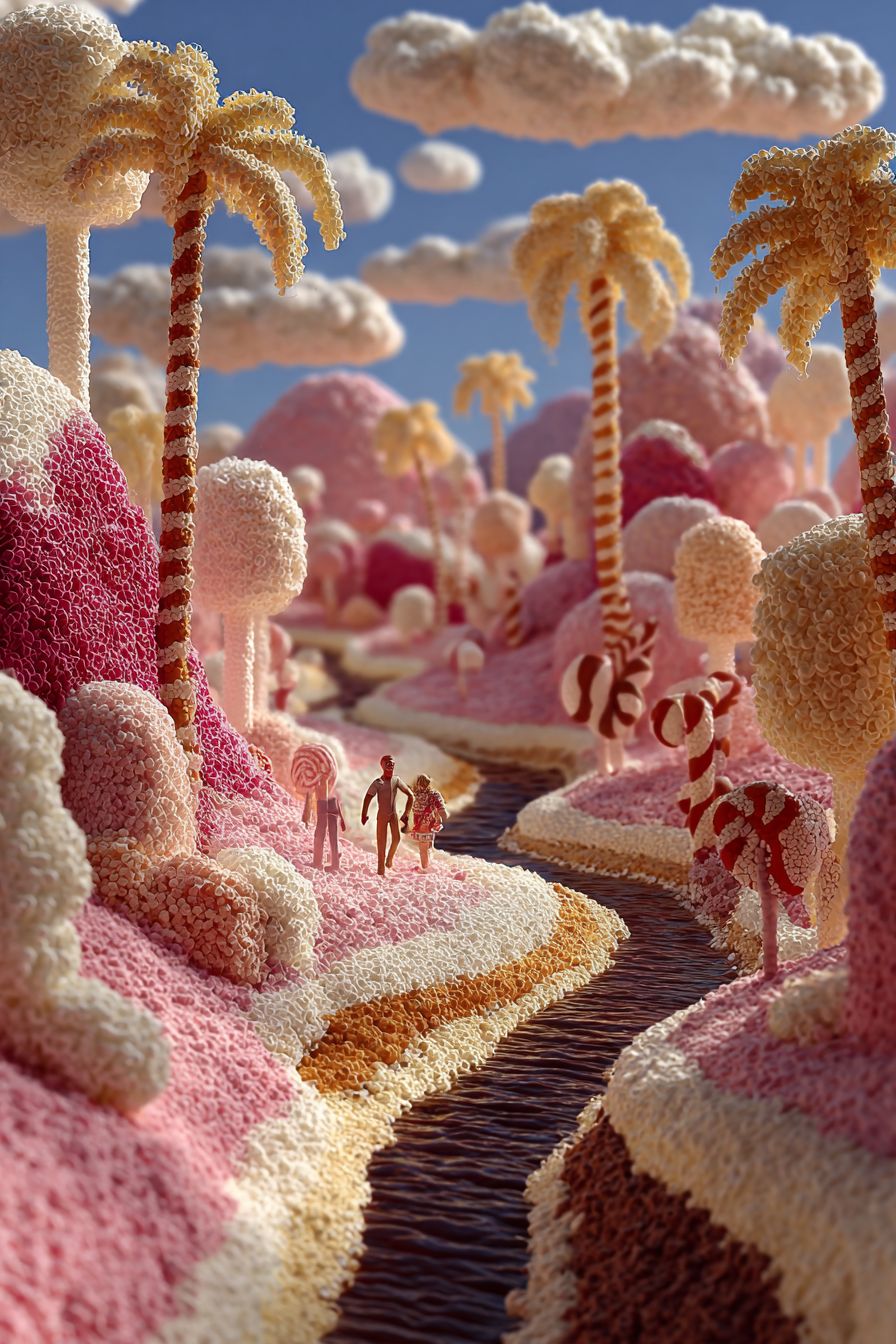 一個充滿奇幻的糖果王國,巧克力河流、糖果拐杖樹和棉花糖雲朵,色彩鮮艷,顽皮的角色在跳舞,蒂姆·波頓風格,超高細節,夢幻般的氛圍。