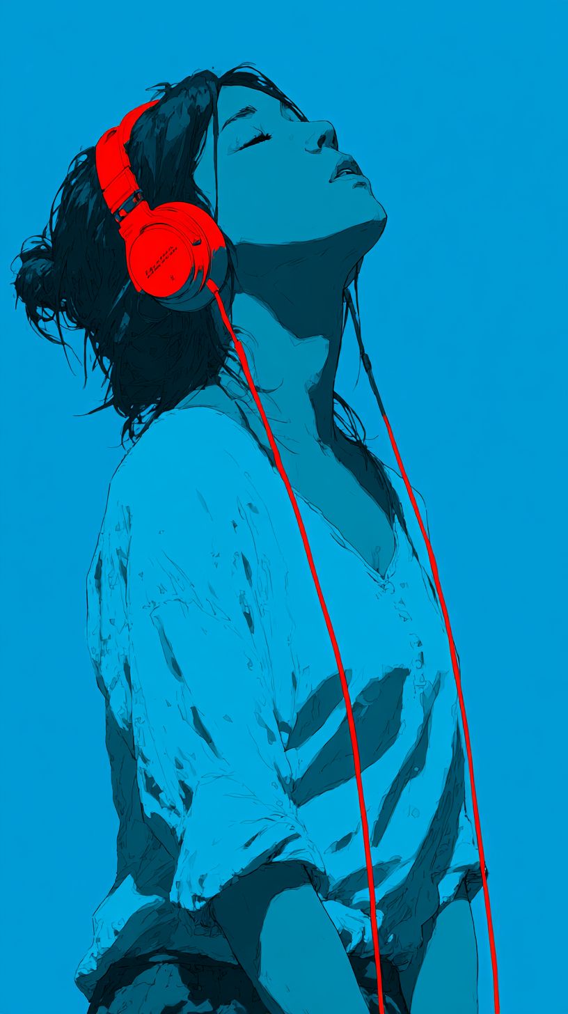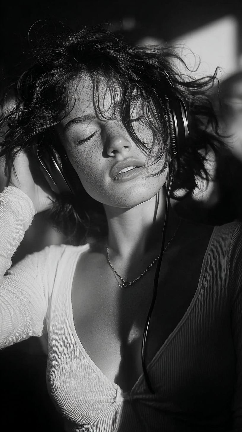 A girl, listening to music, moves her head to the rhythm of the music and her hands will move along as well --ar 9:16 --v 7.0 --s 750