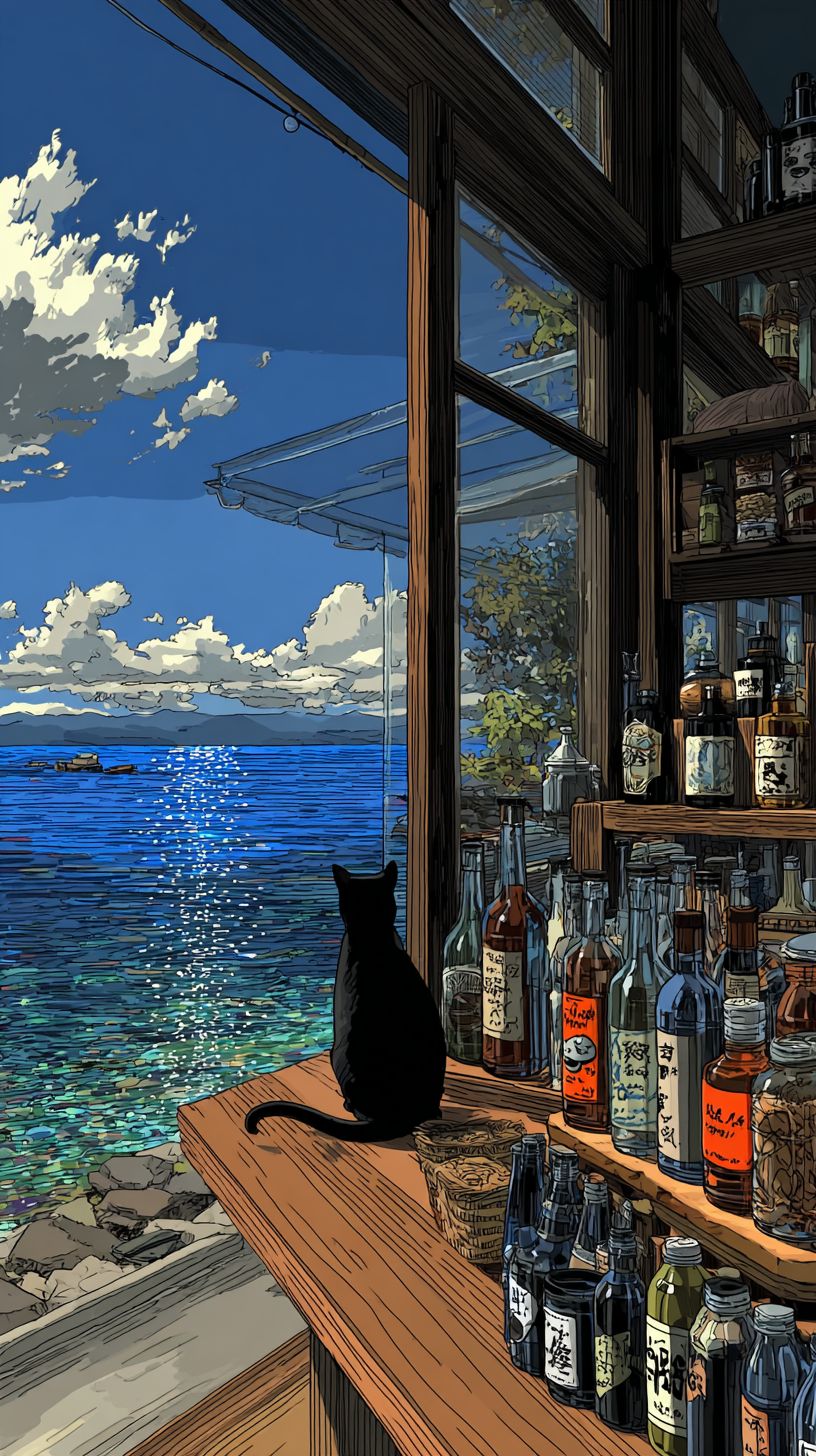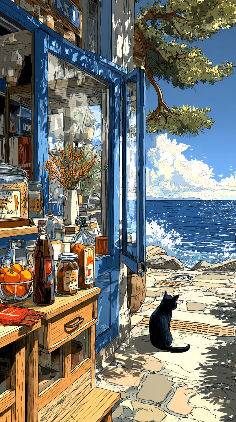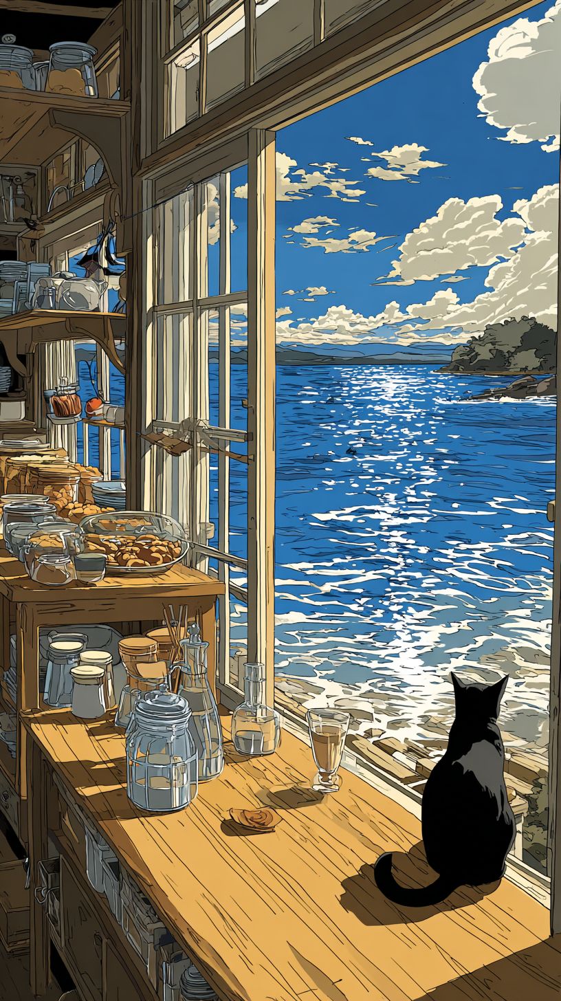 Kiki的麵包店在金色時光中,黑貓坐在窗台上,背景是閃爍的海面