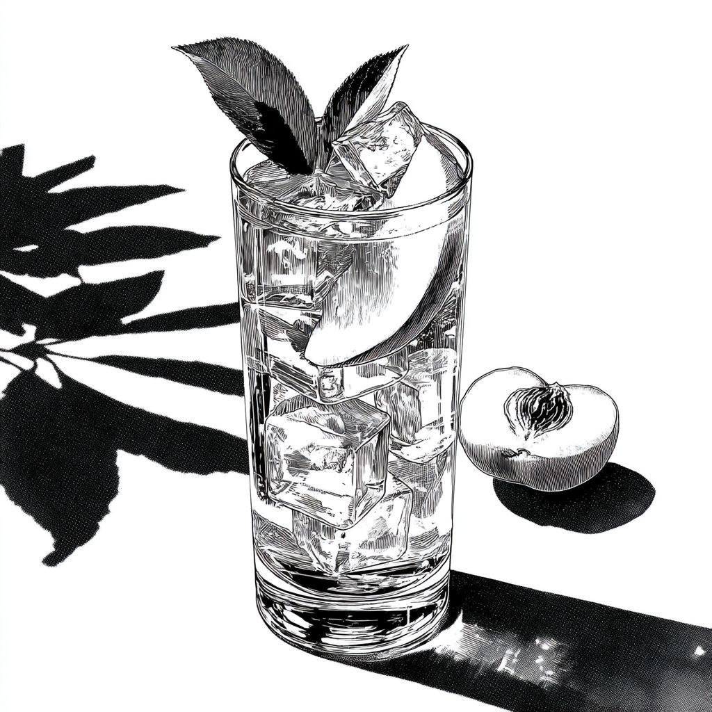 單一極簡主義線條藝術插圖,表現一杯桃杏汽泡飲(無酒精雞尾酒):柯林斯杯,桃子片,清澈液體,乾淨的細線,微妙的細節,無填充形狀,鮮豔的單色,白色背景,無文字,優化為SVG,細節豐富,婚禮美學。