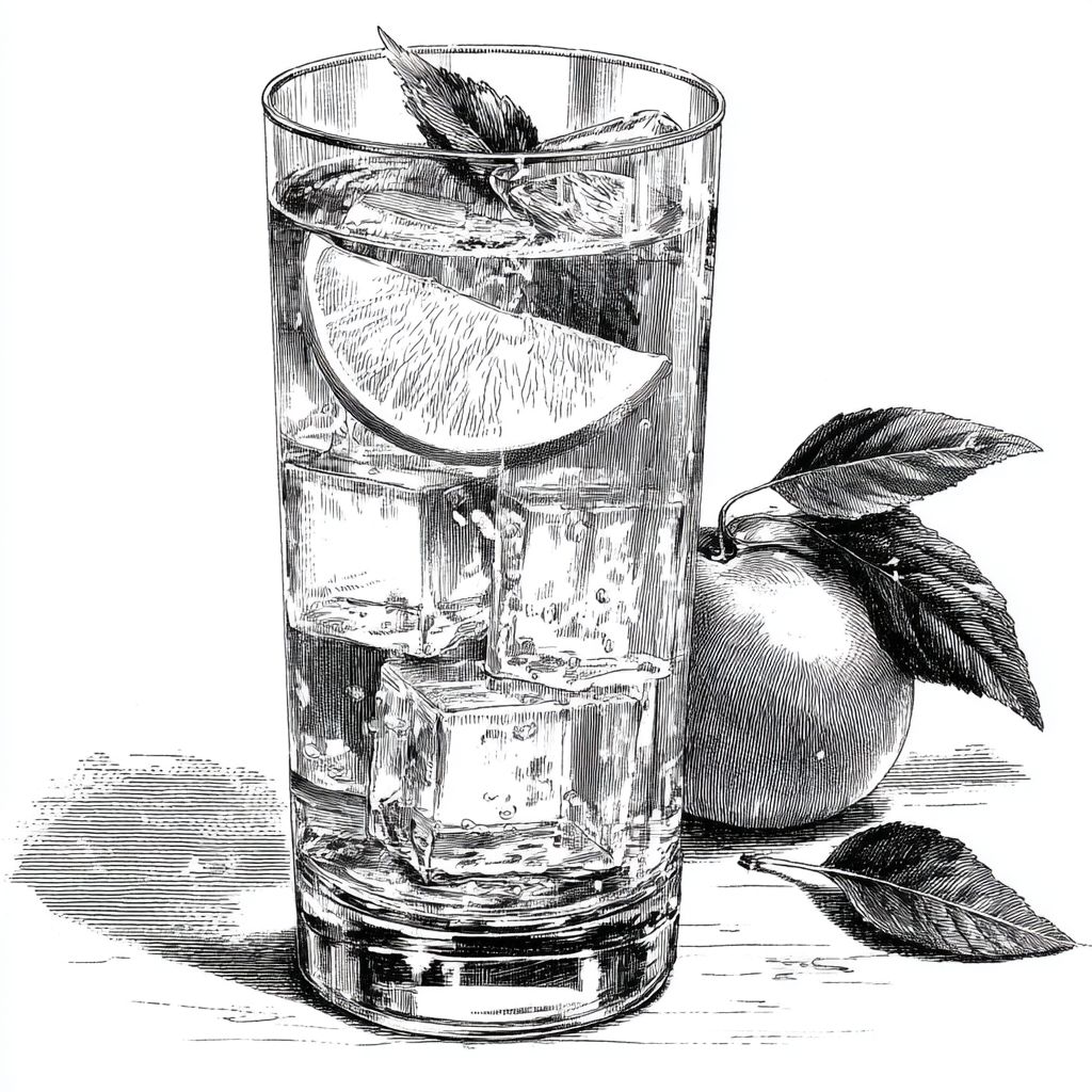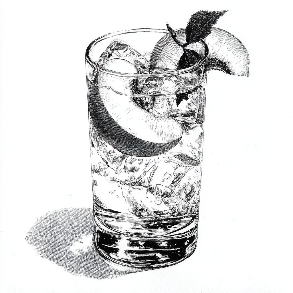 Single minimalist line art illustration of a Peach Apricot Fizz (Mocktail): Collins glass, peach slice, clear liquid, clean thin lines, subtle details, no filled shapes, vibrant monochrome , white background, no text, optimized for SVG, highly detailed, wedding aesthetic. Black and white --s 750