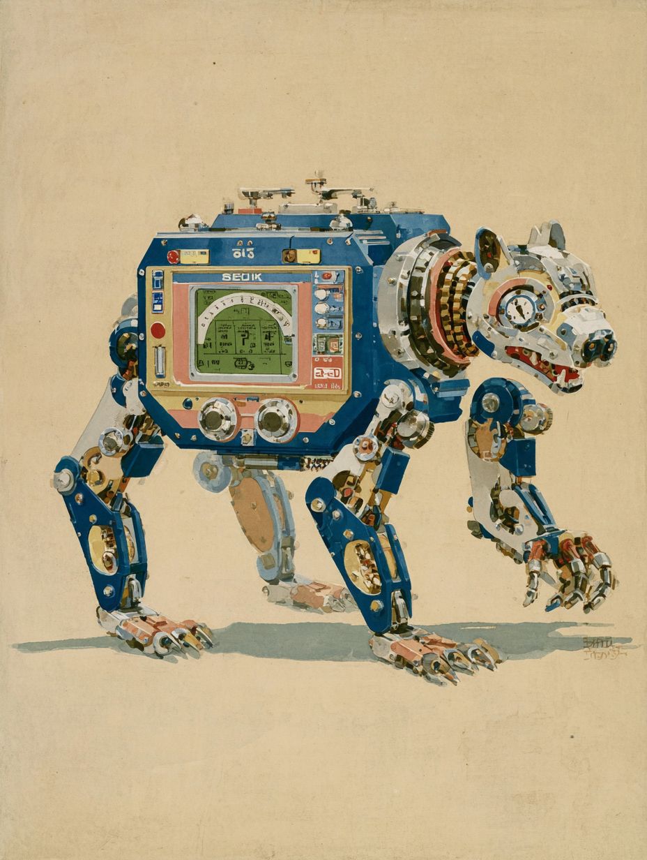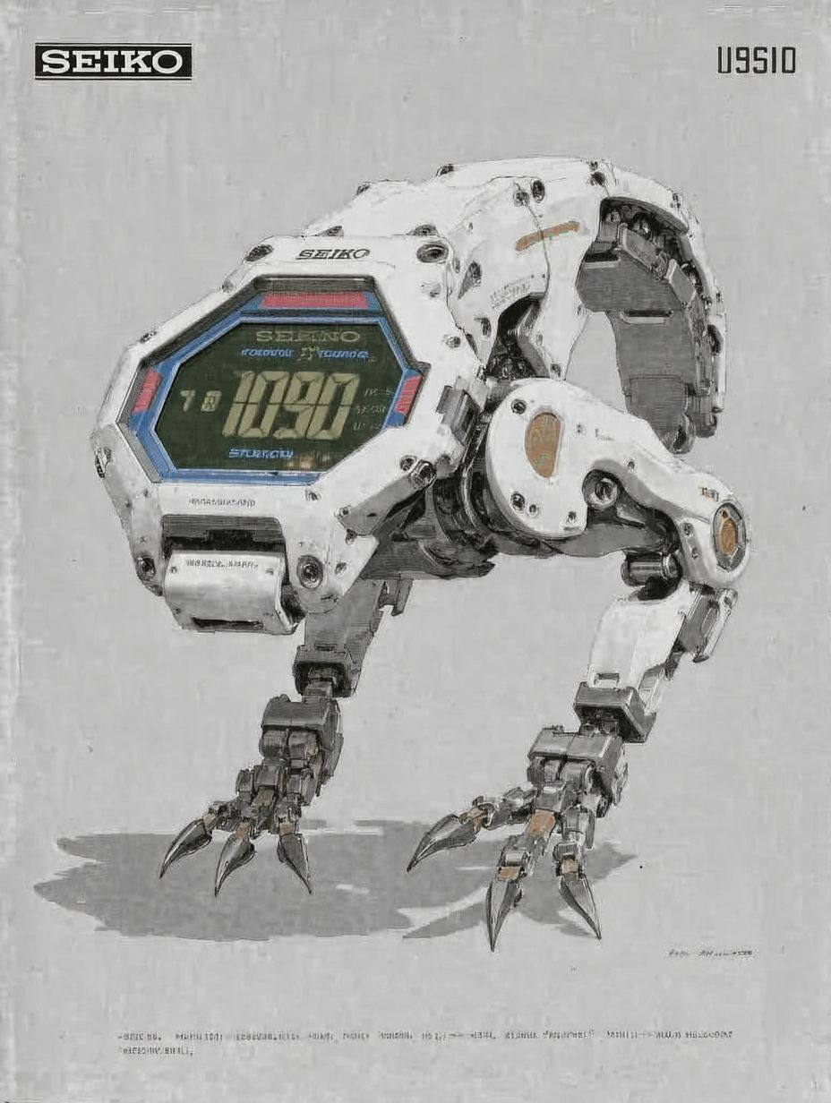 1980s Japanese magazine ad for a futuristic digital wristwatch, Seiko watch with robotic animal body, retro-tech aesthetic, LCD display, chrome limbs, nostalgic print texture, vintage fonts, colorful layout with Japanese text, pop sci-fi vibe, highly detailed, soft halftone print style, analog futurism, hyper-realistic, high detail, soft lightning, vibrant colorful background --chaos 90 --ar 3:4 --exp 60 --raw --sref 3213025849 --stylize 400 --v 7.0