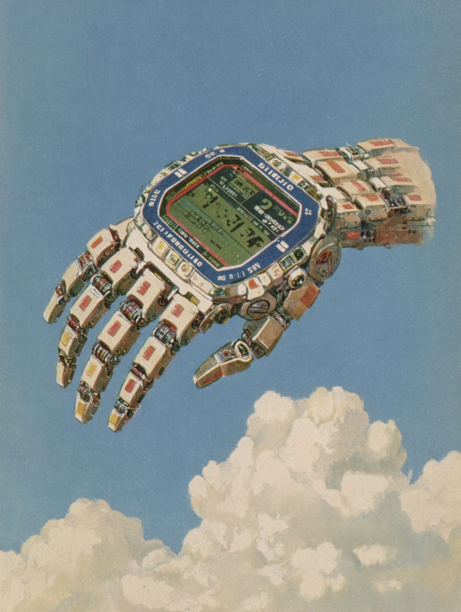 1980年代的日本雜誌廣告展示了一款未來感十足的數字腕錶, 具有機械動物外形, 復古科技美學