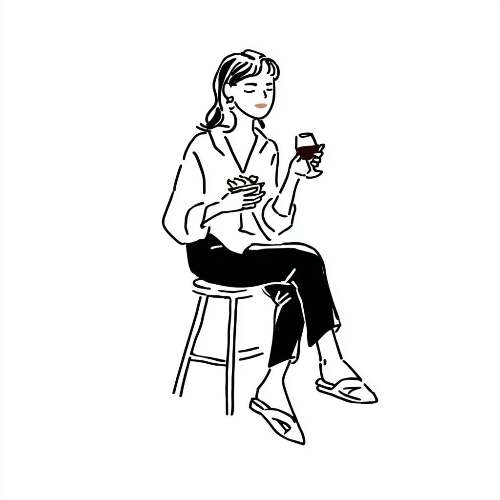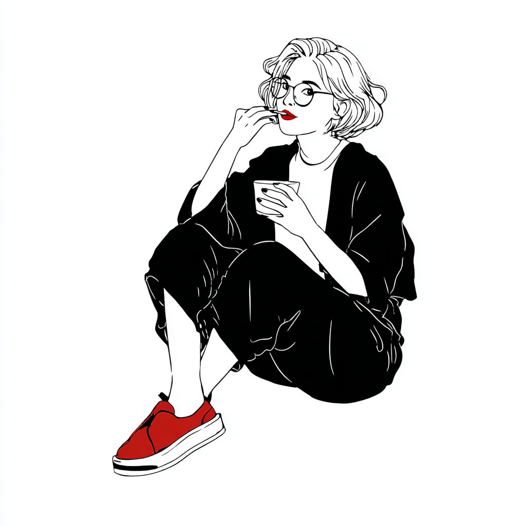 1 sticker, simple line cartoon style, must be in black and white with a bit of color as an accent, with a little color as an accent, must be a 28-year-old lady sitting and eating, wearing wine-red leather shoes, cartoon style, casual style, minimalist style, black and white line drawing, thicker lines, lively movements, one main subject in the middle of a white canvas --v 7.0