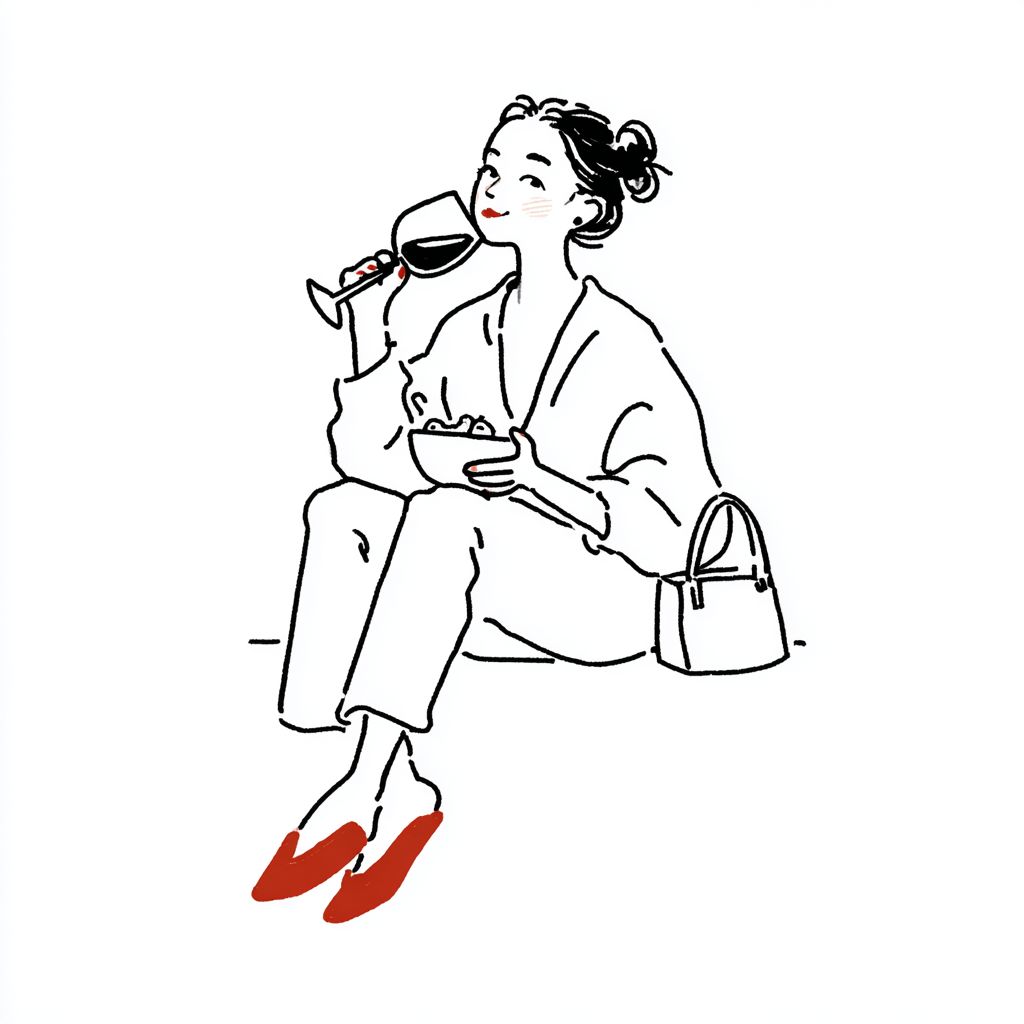 1個貼紙,簡單線條卡通風格,必須是黑白色,帶有一點色彩作為點綴,必須是一位28歲的女士坐著吃東西,穿著酒紅色的皮鞋,卡通風格,休閒風格,極簡風格,黑白線條畫,更粗的線條,生動的動作,中央有一個主要主題在白色畫布上。