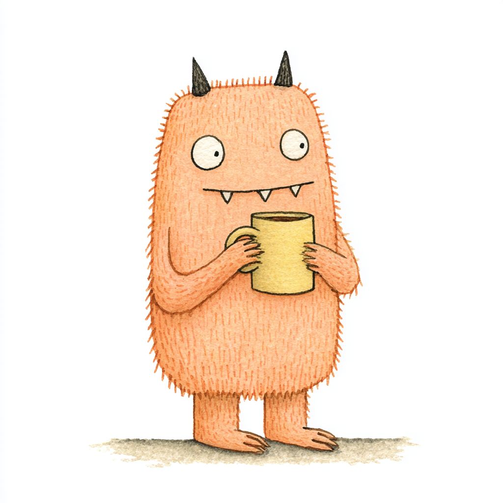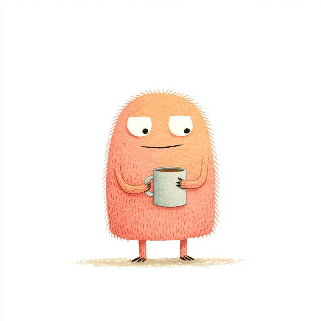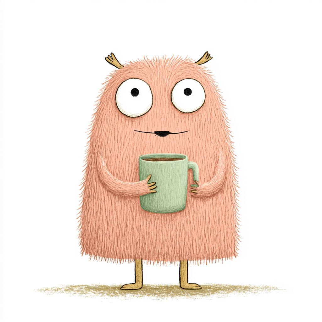 a pink fluffy mini monster sipping a cup of tea, eyes half-closed in a serene moment, full body image, cute and quirky, Jon Klassen style, white background --chaos 20 --profile xlvckt9 --stylize 250 --v 7.0