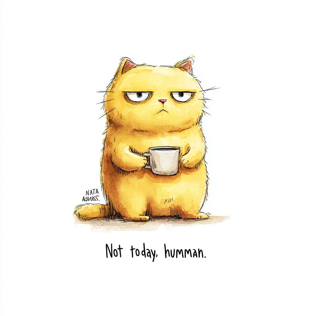 simple yellow cat, style of Akihiko Yoshida , holding a cup of coffee in its paws and a grumpy expression on its face. white background. text below "Not today, human." --ar 1:1 --v 7.0