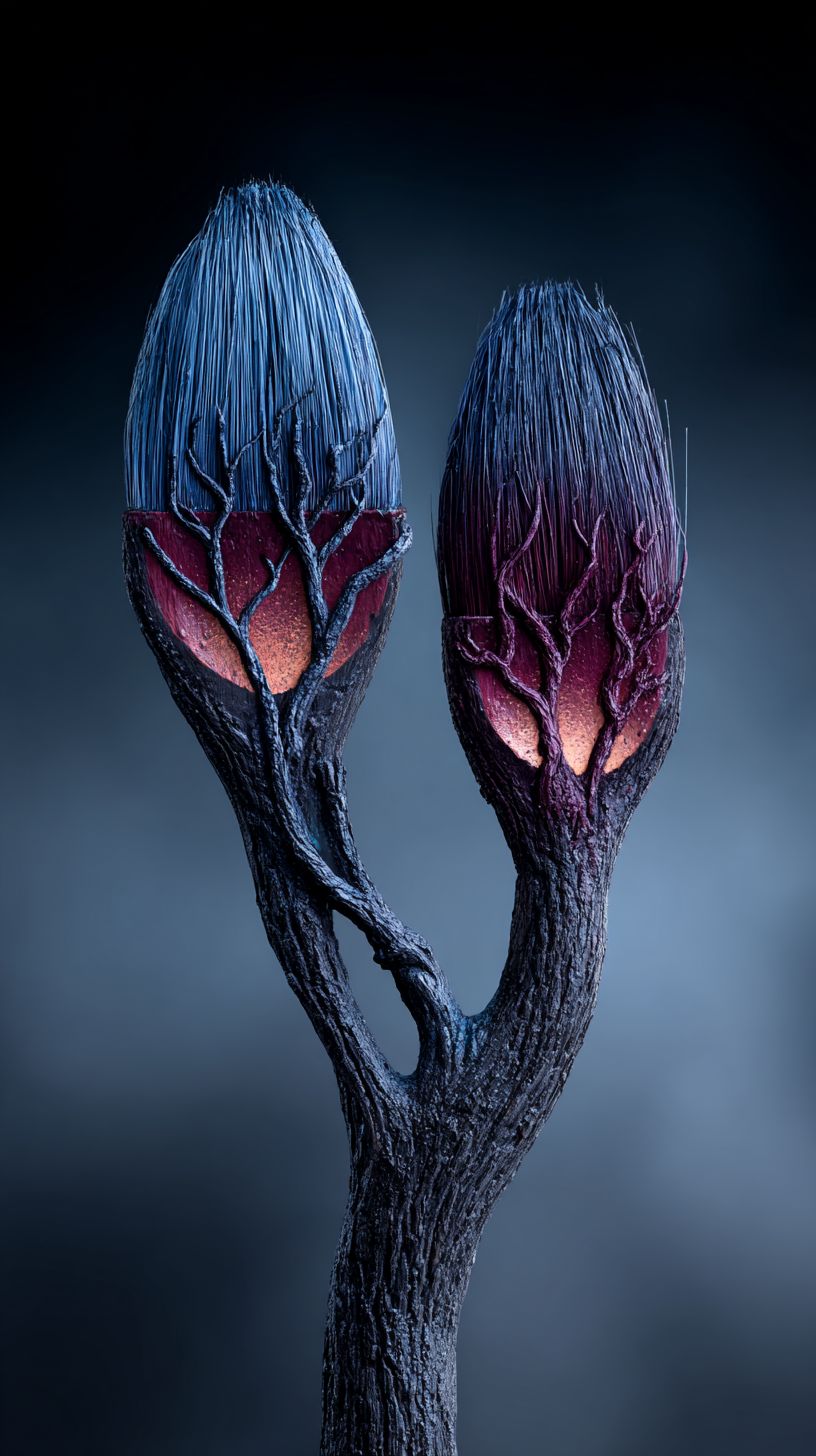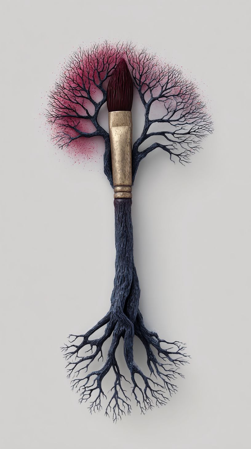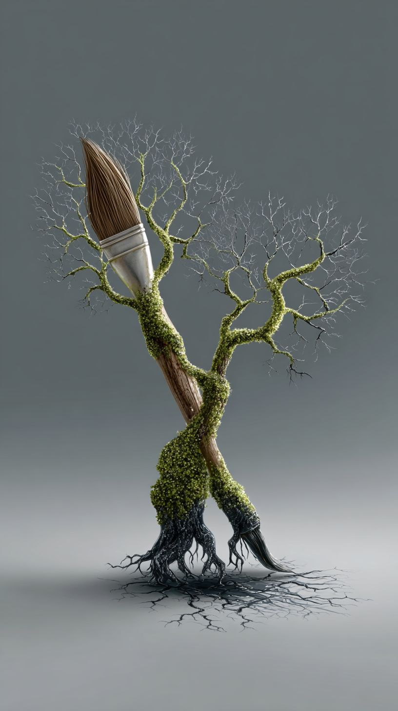 two paint brushes, one growing out of the other like a tree stem --ar 9:16 --profile jao7vcu --stylize 250 --v 7.0