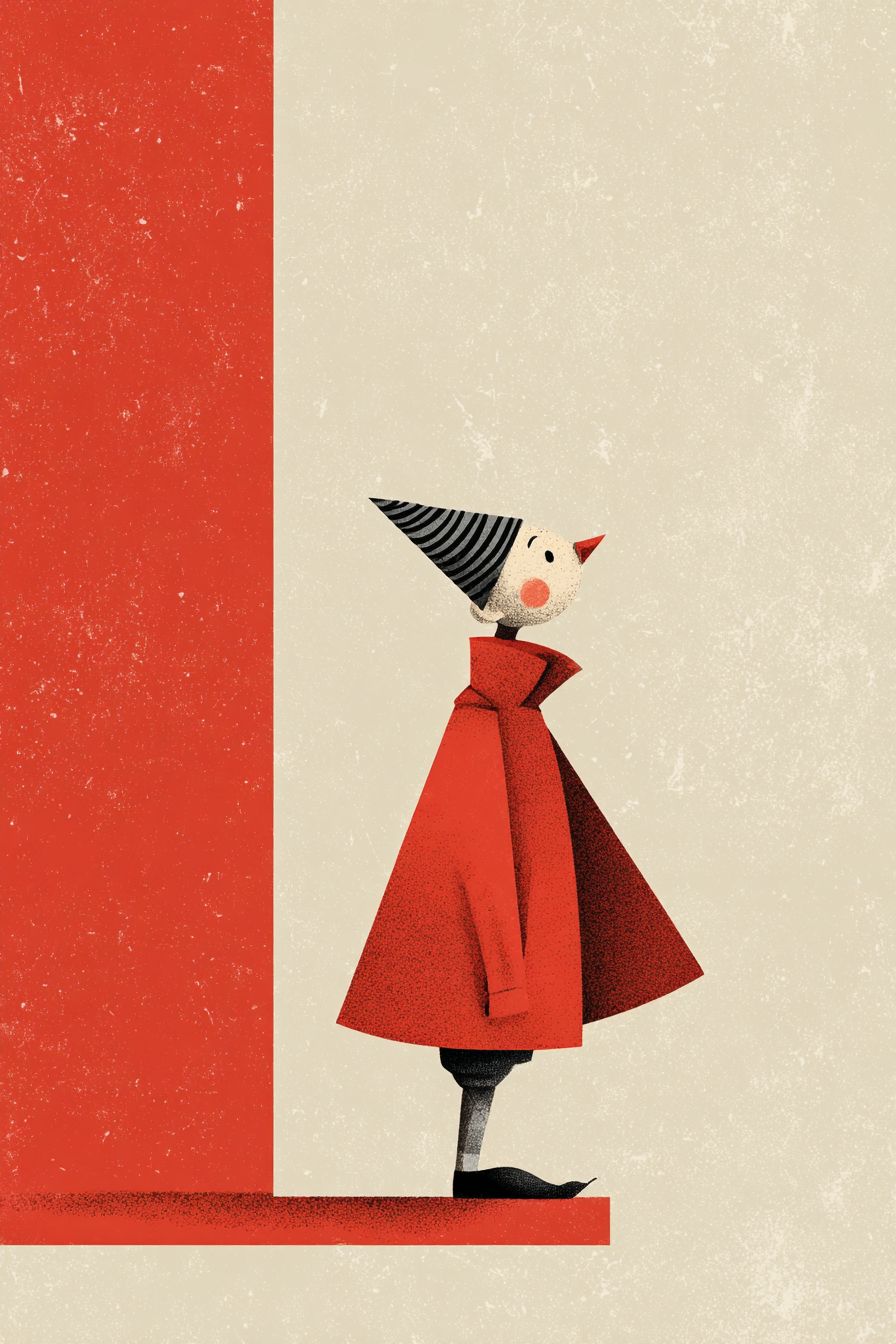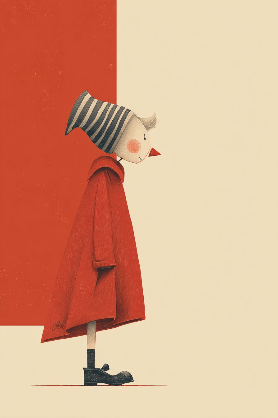 極簡復古海報插圖,風格模仿20世紀初《法官》雜誌的封面,作者為瓦倫丁·桑德伯格。裝飾性的平面配色構圖,輪廓清晰,細節優雅。布拉提諾,一個快樂的木偶男孩,面朝側面,長鼻子,帶著條紋帽,穿著鮮紅色斗篷和黑色鞋子,站在空白的白色背景上,旁邊有一個實心紅色方塊。他的臉色蒼白,風格化,表情顫玩而優雅。視覺風格圖形化,色調平面,最小陰影,輪廓精緻。顏色調色板:紅色、白色、黑色和柔和米色。氛圍輕鬆、幽默、藝術,像舊時兒童時尚插圖。沒有文字。