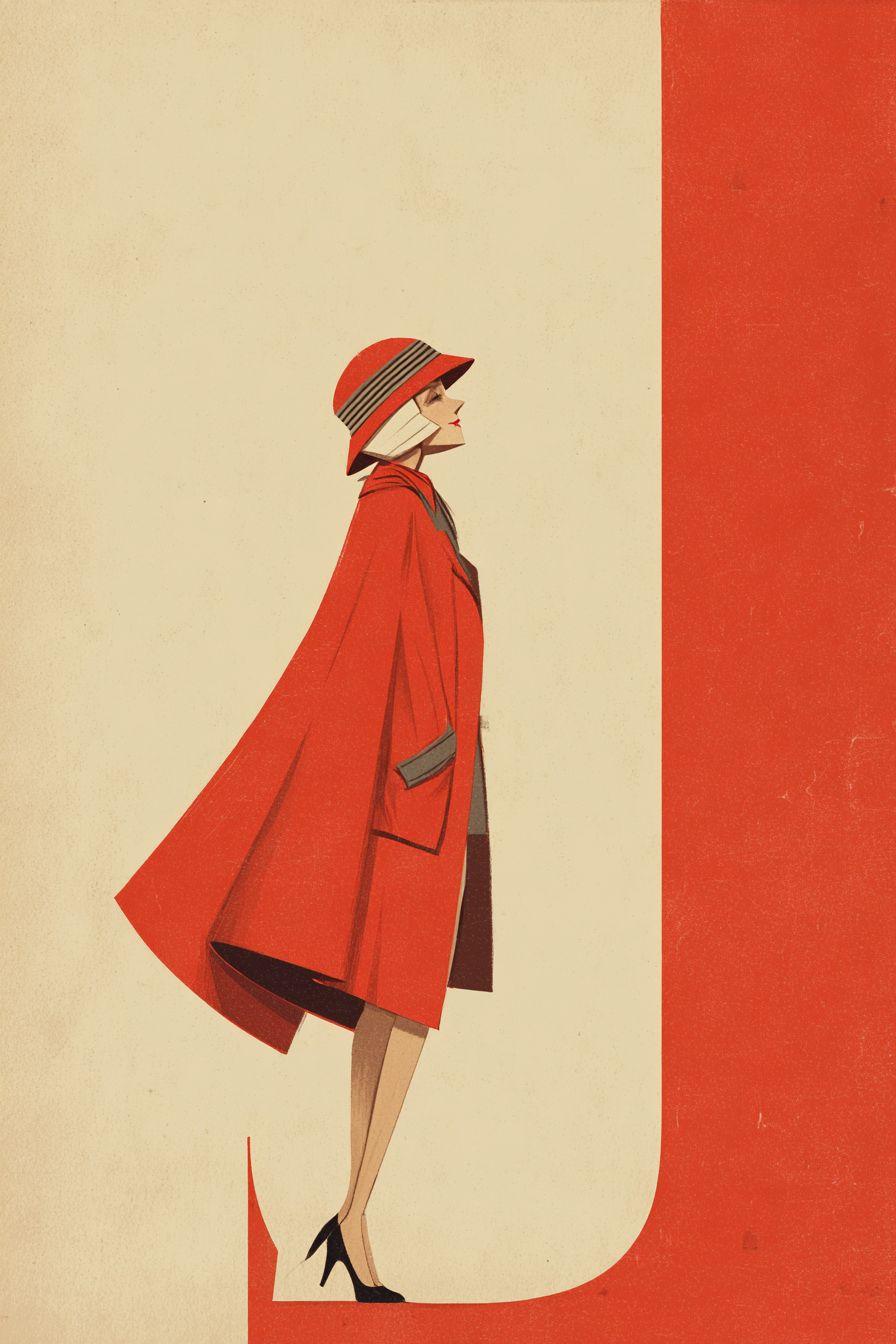 Minimalist vintage poster illustration in the style of early 20th-century Judge magazine covers by Valentine Sandberg. A decorative flat-color composition with clear outlines and elegant detail. Buratino, a cheerful wooden puppet boy with a long nose and striped hat, is shown in profile wearing a bright red cloak and black shoes, standing on a blank white background with a solid red color block. His face is pale and stylized, with a playful, refined expression. The visual style is graphic, with flat tones, minimal shading, and a refined silhouette. Color palette: red, white, black, and soft beige. The mood is light, humorous, and artistic like a vintage fashion plate for children. No text. --no background details --no horse --ar 2:3 --raw
