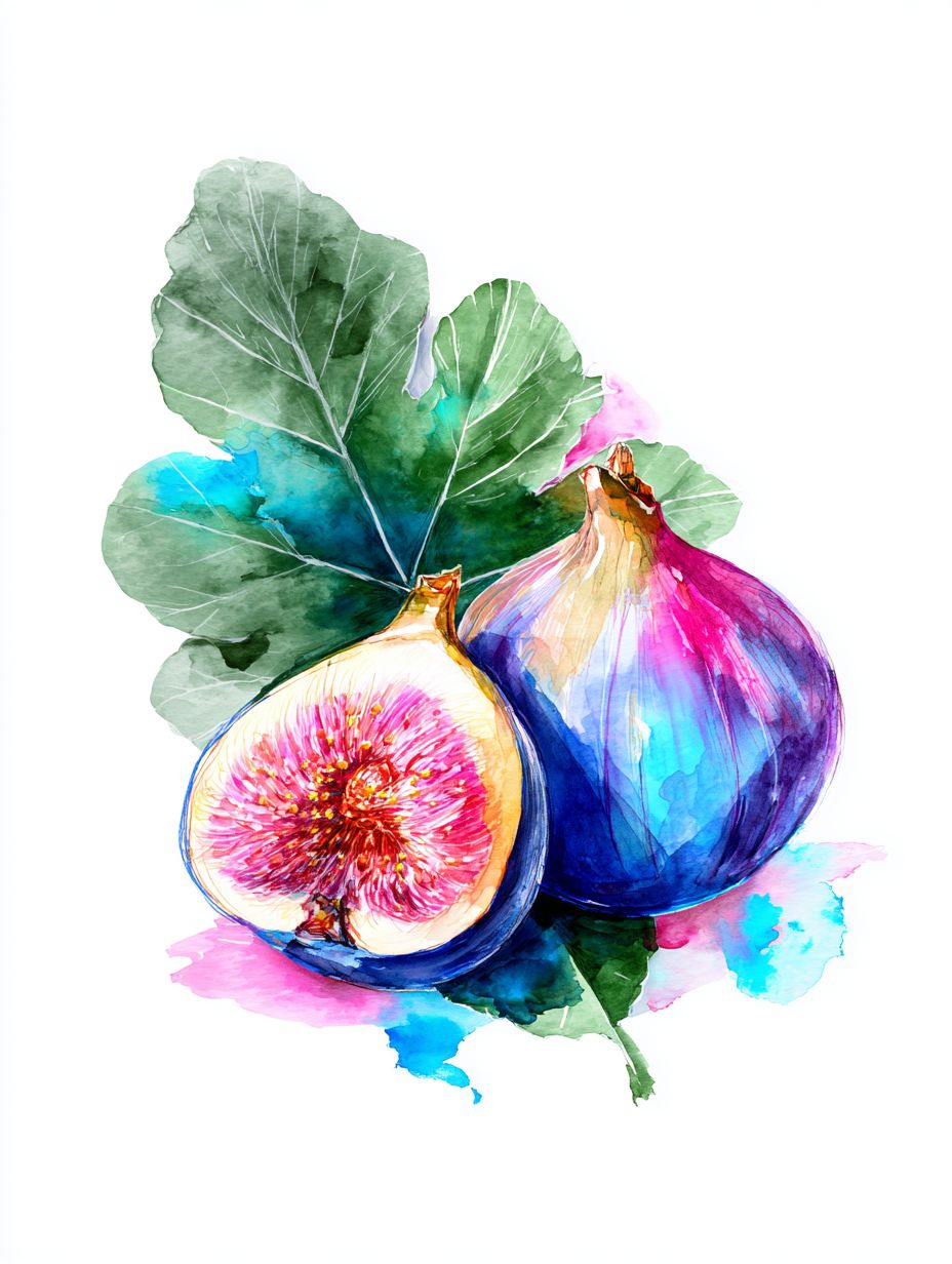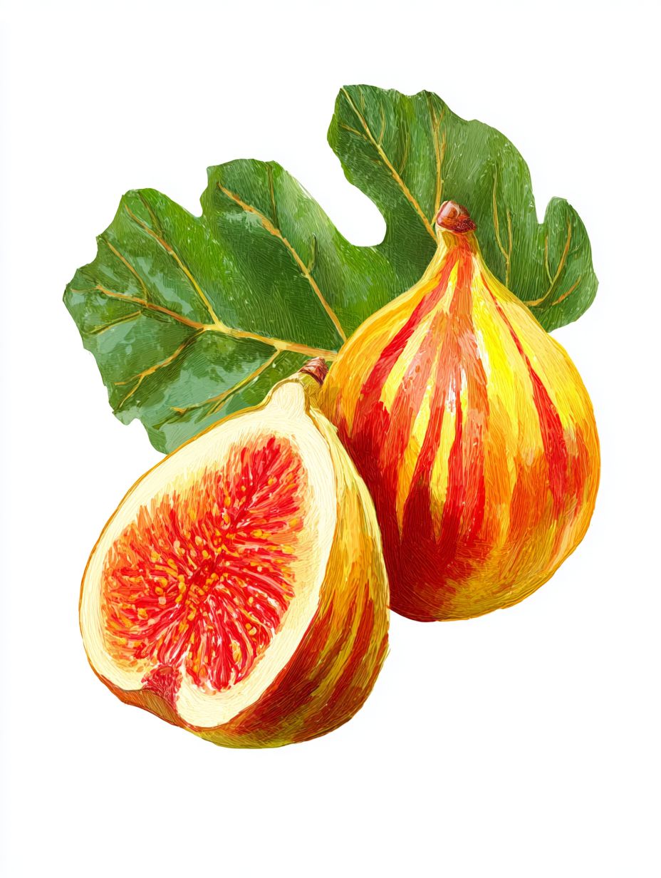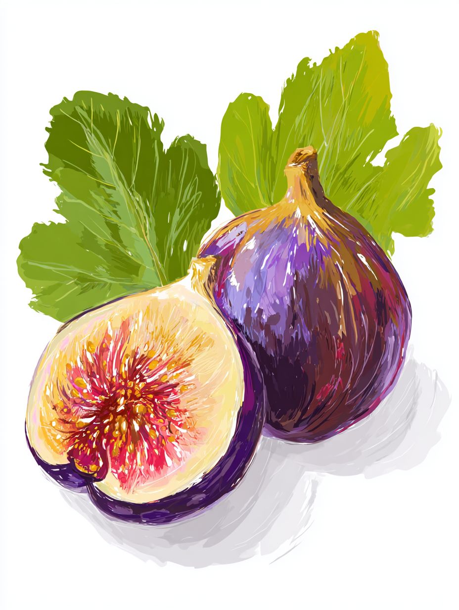 一幅生動的插圖,描繪了兩個無花果,其中一個被切成了兩半。使用鮮豔的顏色,筆觸明顯。背景有葉子,整體孤立在白色背景上。