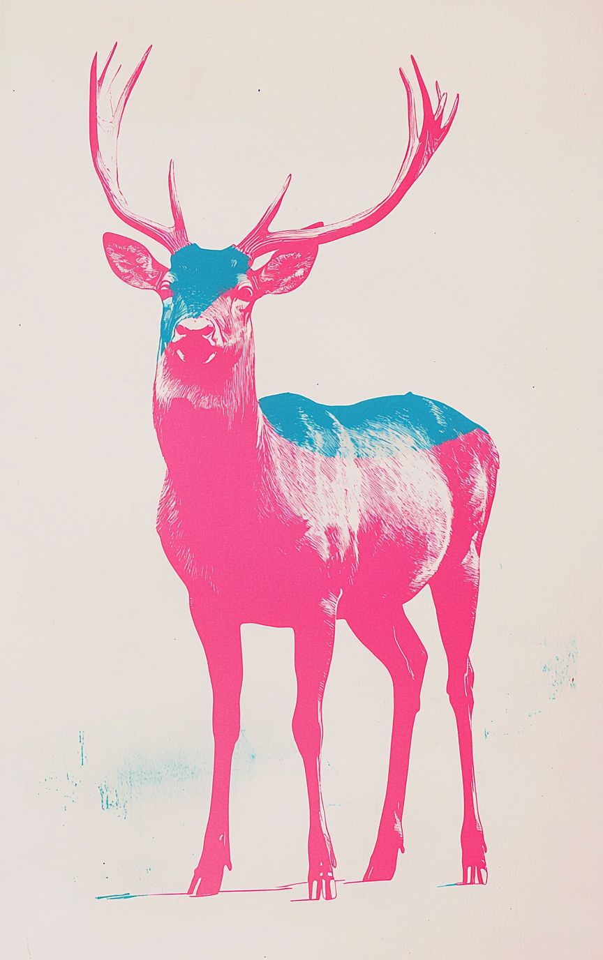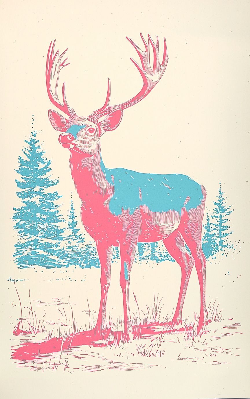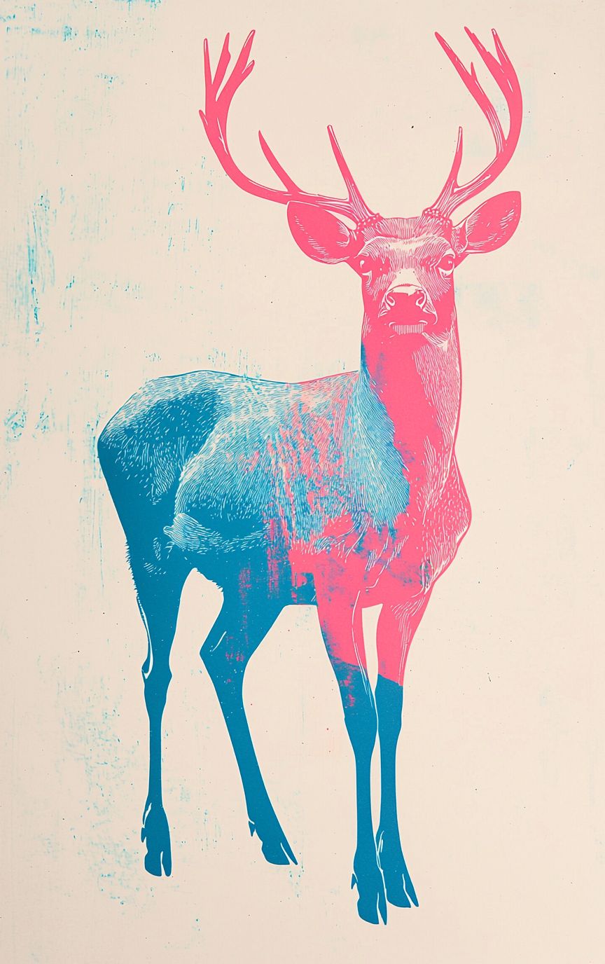 這張Risograph印刷展示了一隻可愛的粉色和藍色的雄鹿,站在地上,抬起頭,採用引人注目的插圖風格,使用大膽的塊狀印刷和平面簡約的角色。使用的顏色是淺青色和深琥珀色,創造了一個簡單線條的全身肖像。