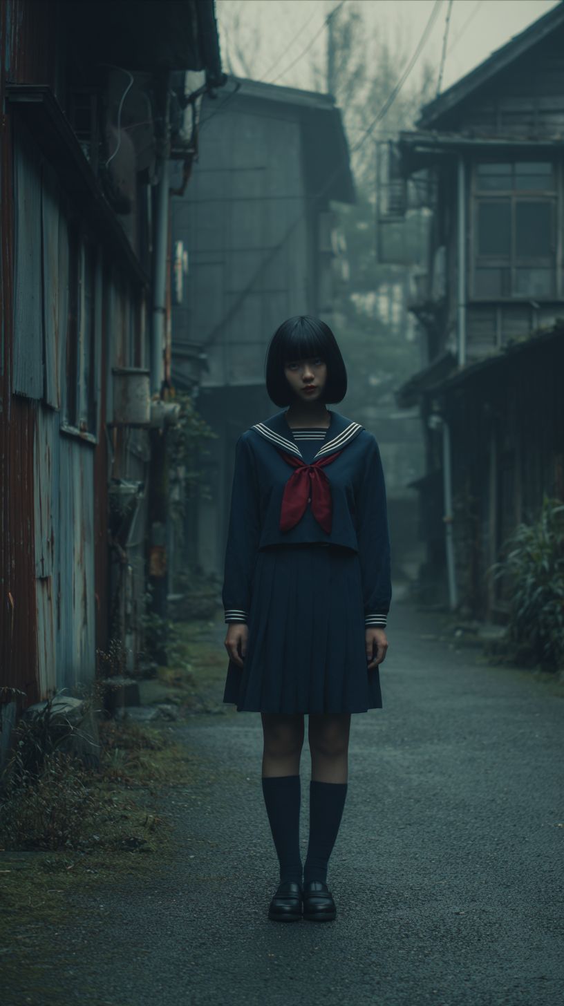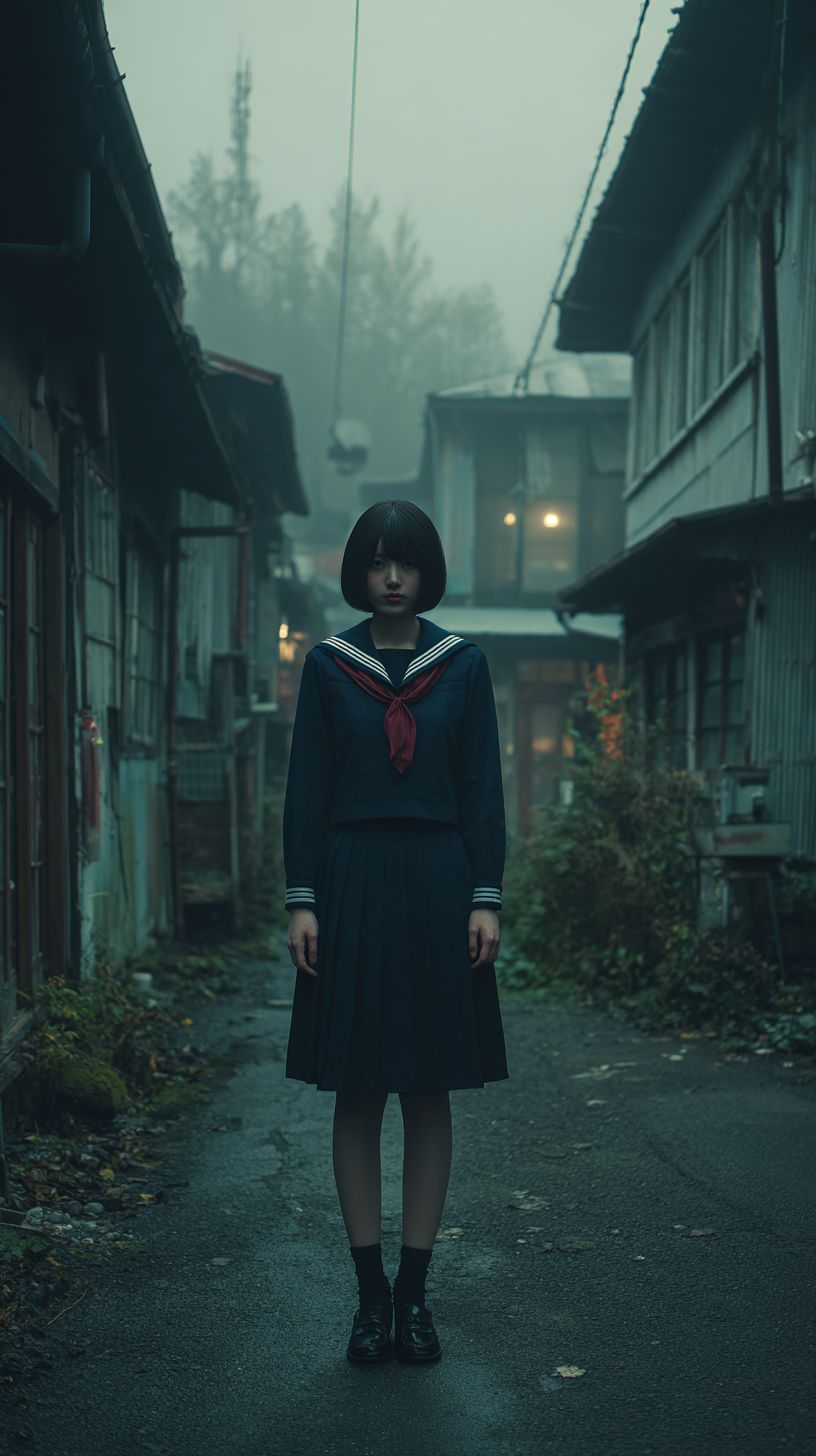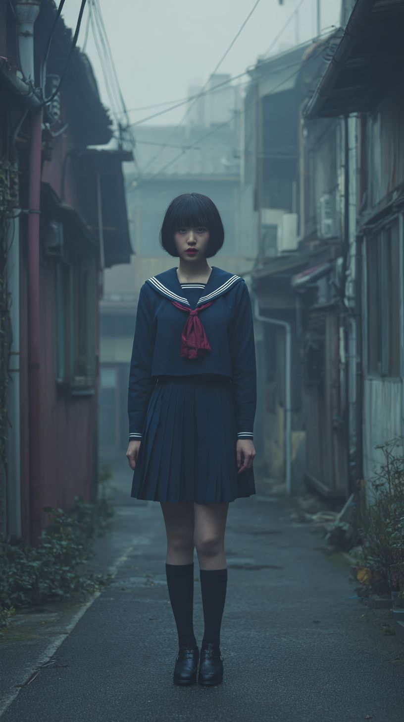 一名日本高中女孩的全身照,她有著短短的波波頭髮型,正小心翼翼地走過一個黑暗、籠罩在霧氣中的小巷,地點是1960年代的一個寧靜鄉村小鎮。她穿着傳統的冬季水手風格校服,深海軍藍色,長袖上衣的領口和袖口上有三條白色條紋,胸前系着深紅色的領巾式絲帶,深海軍藍色的百褶裙到膝蓋,搭配海軍藍的及膝襪和黑色皮質便鞋。狹窄的小巷兩側是老舊但維護良好的木質和混凝土建築,展現出日常生活的痕跡,有金屬管道、電表、後門、褪色的標識以及生锈的窗格。昏暗的燈光透過霧氣投射出柔和的陰影,而粗糙沥青上的水洼反射着周圍的光輝。稀疏而低調的植被沿著邊緣生長。這個場景營造出一種安靜的心理恐怖氣氛,受到《沉默之丘》的啟發,同時融合了昭和時代的懷舊感與令人不安的沉默。她的臉、手和腳的細節極為精致,具有真實的質感。電影般的燈光和柔和的復古色調完美地襯托出這一恐怖氣氛,畫面分辨率達到8K。