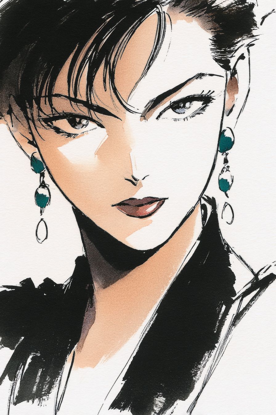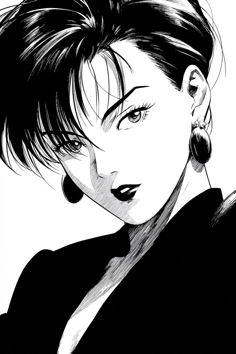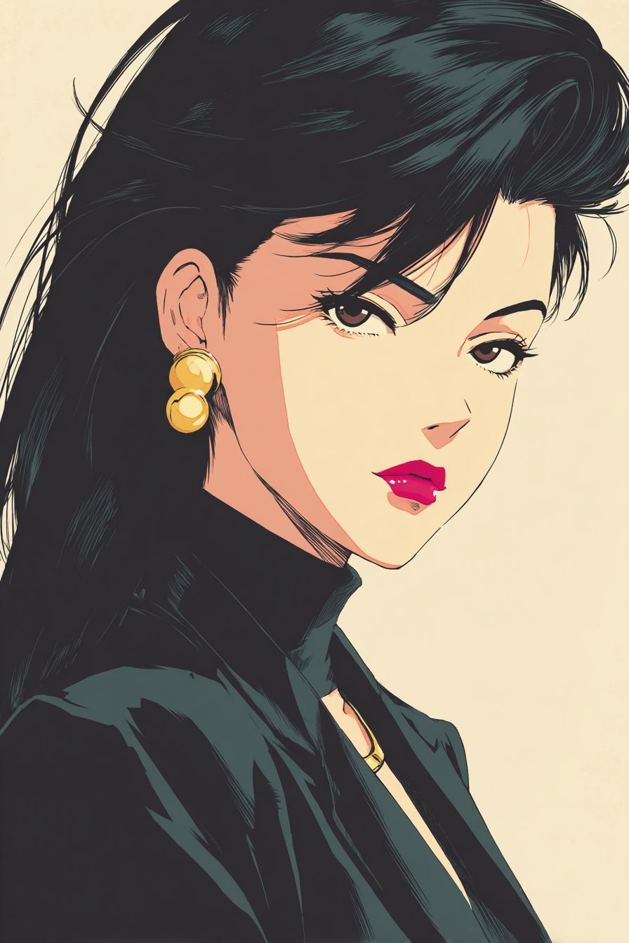 日本動畫,創作一幅受1987年由狩野誠作導演的《邪惡城市》啟發的插圖,描繪一位美麗的模特,她的表情顯得傲慢,眼睛更狹窄、鋭利且嚴峻,姿勢優雅,身穿高端時尚服裝,戴著耳環。