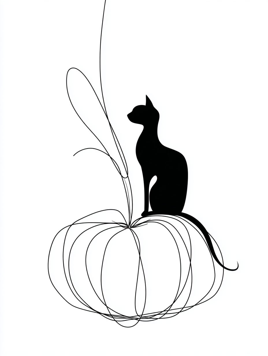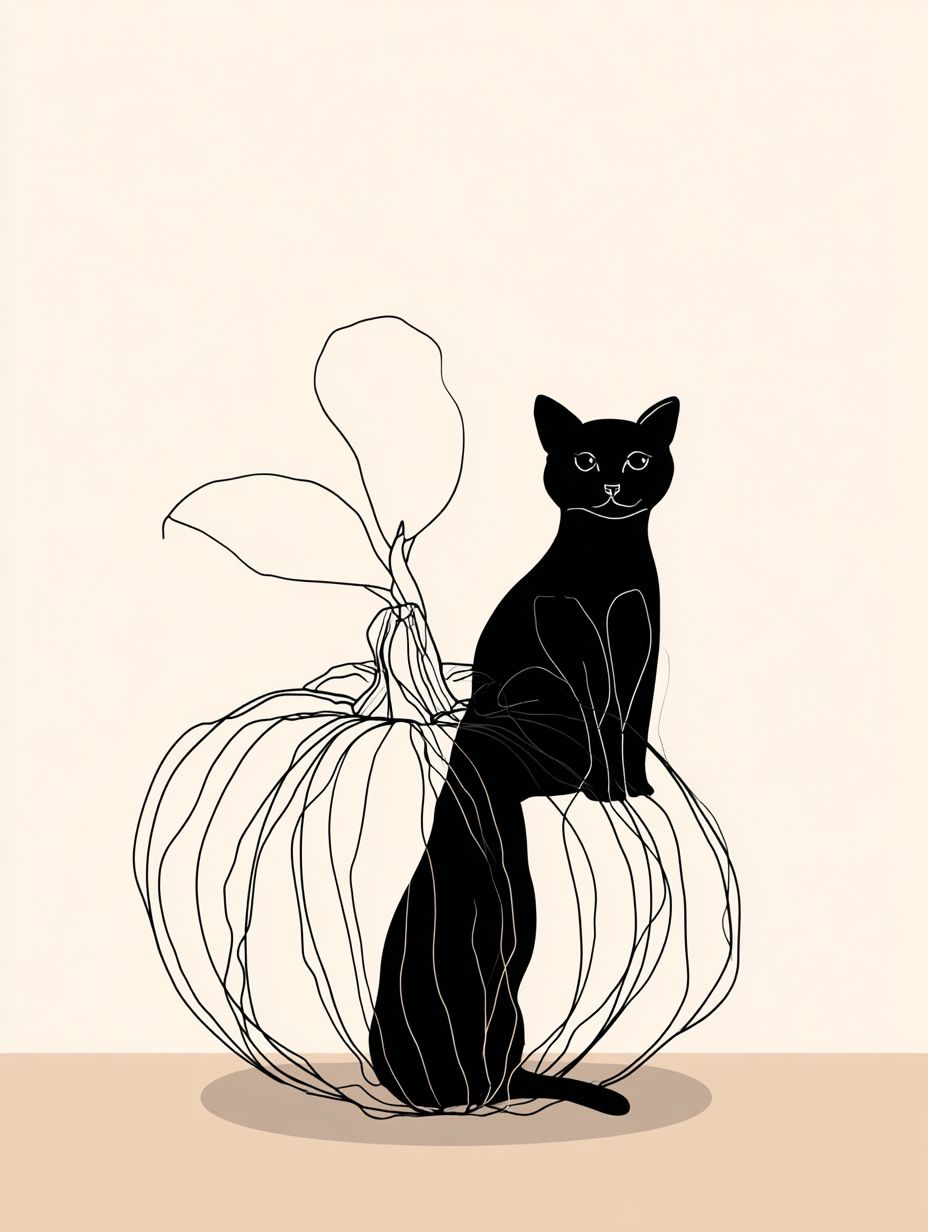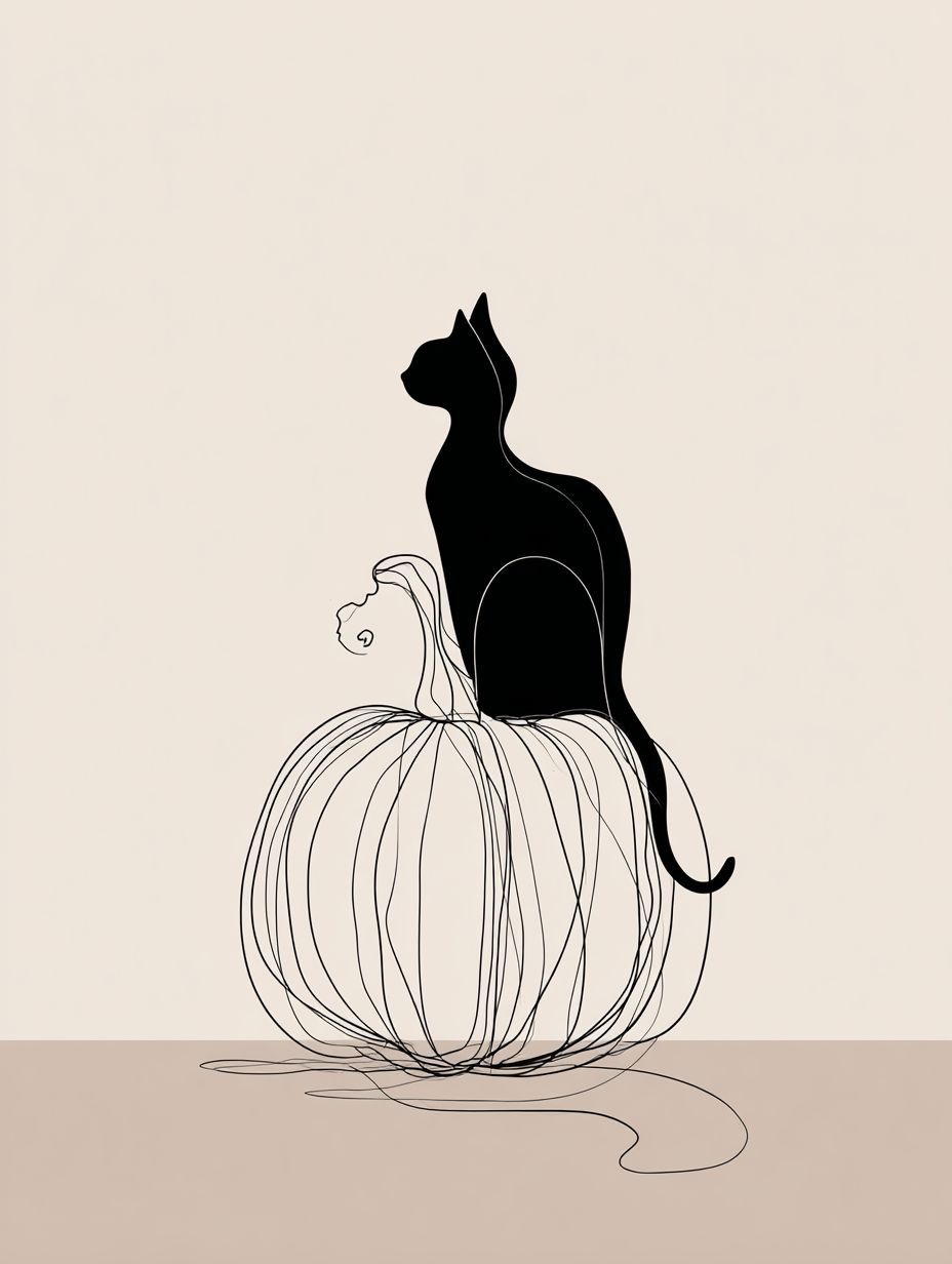 Line art pumpkin and black cat illustration, elegant monochrome, minimal composition, modern wall art, soft shadows, clean background --ar 3:4 --raw --v 7.0