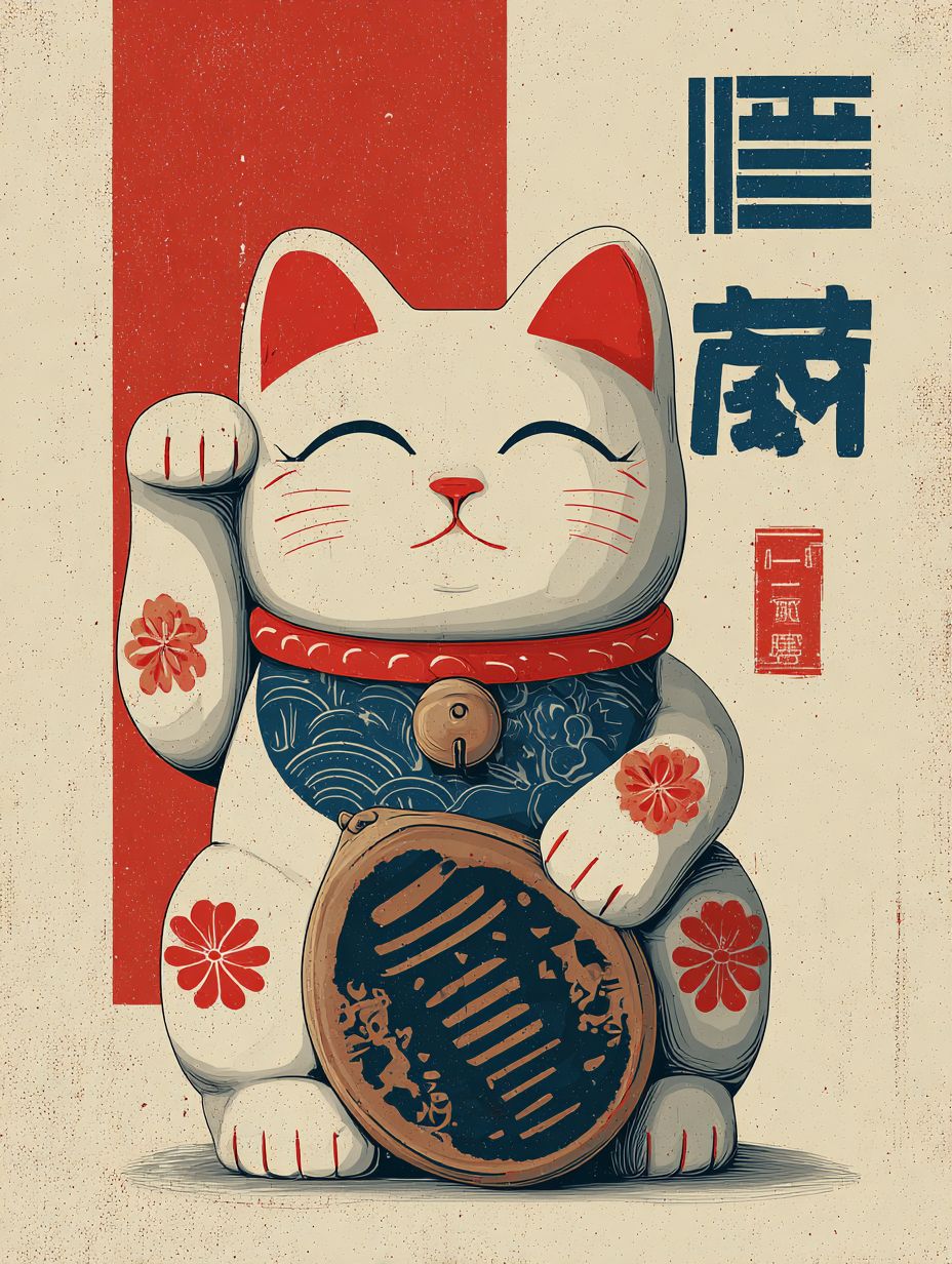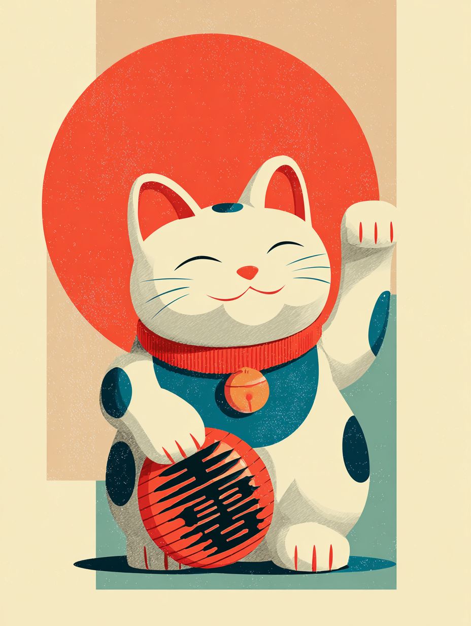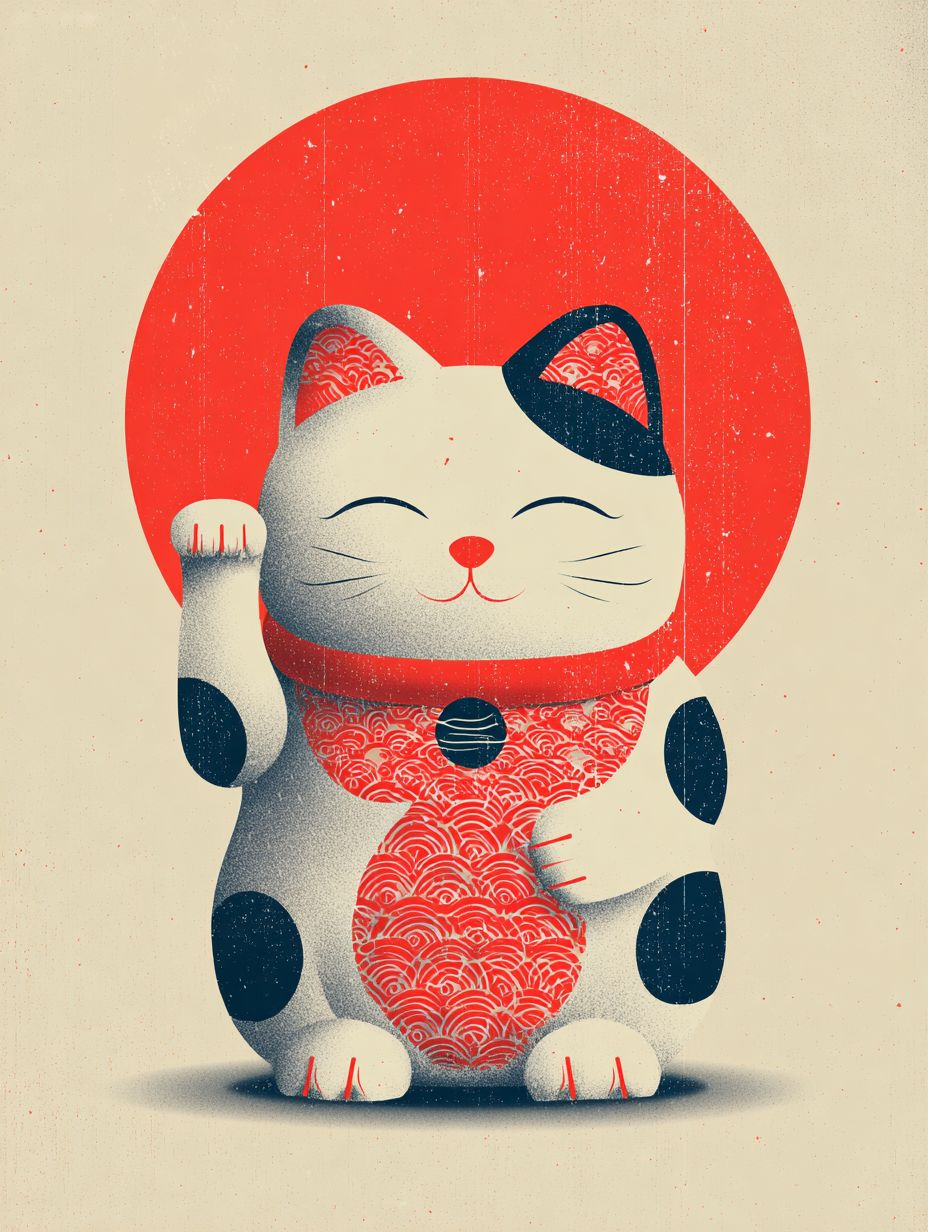 Japanese Lucky Cat (Maneki-neko), stylized retro poster art, bold clean colors, minimalist background, decorative charm aesthetic --ar 3:4 --v 7.0