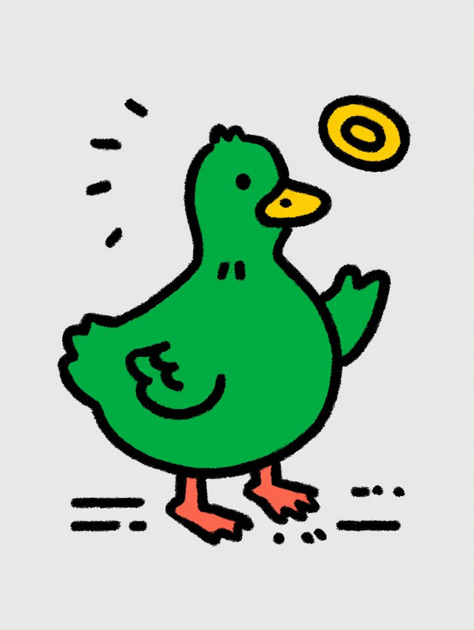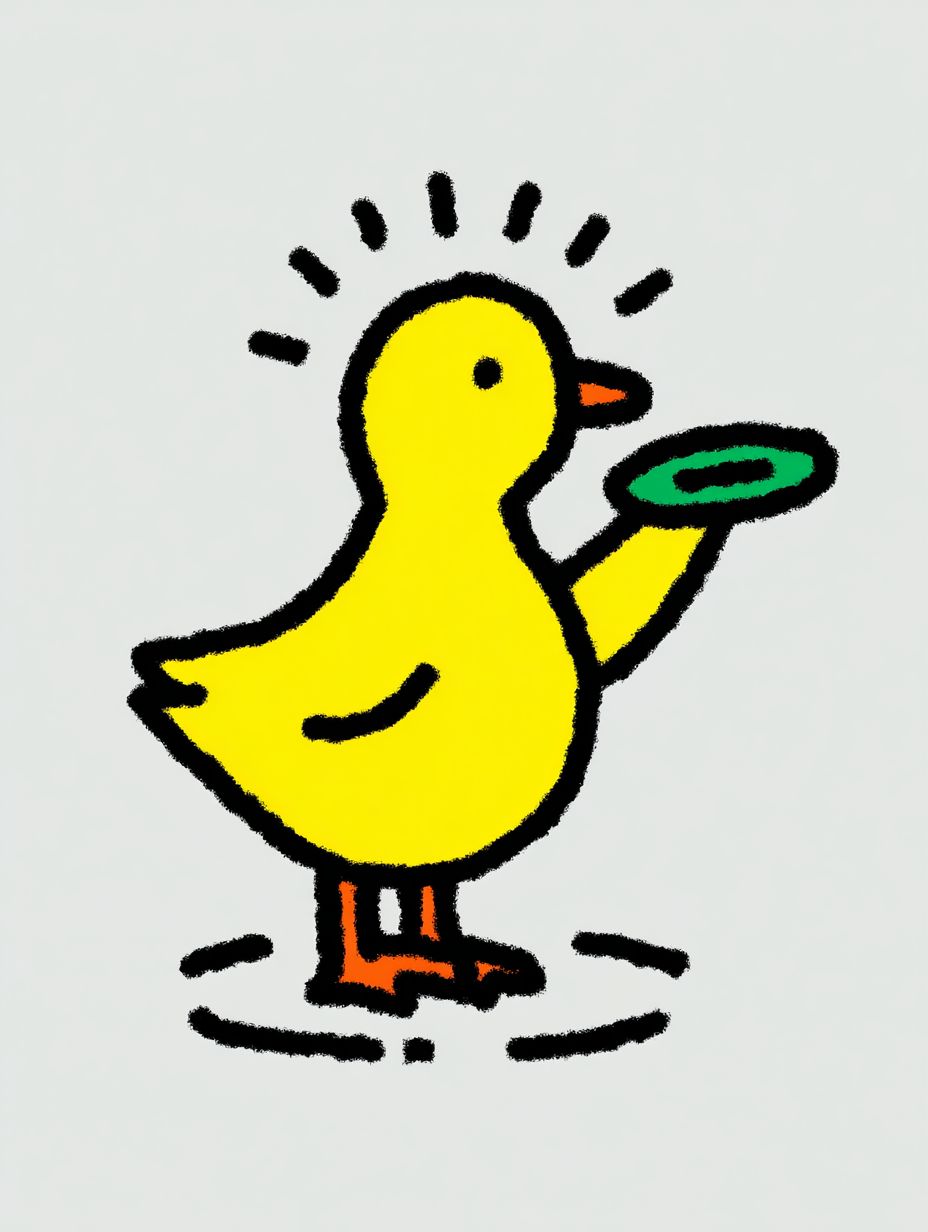 一隻可愛的小黃鴨在玩飛盤。簡單、大膽的線條,簡單的插圖,純色,最少的細節,極簡風格,白色背景。