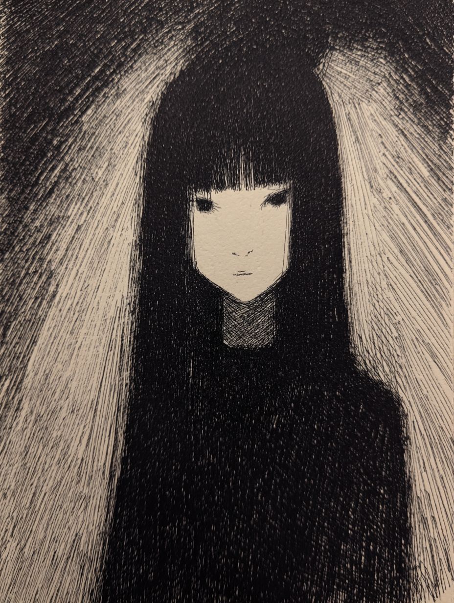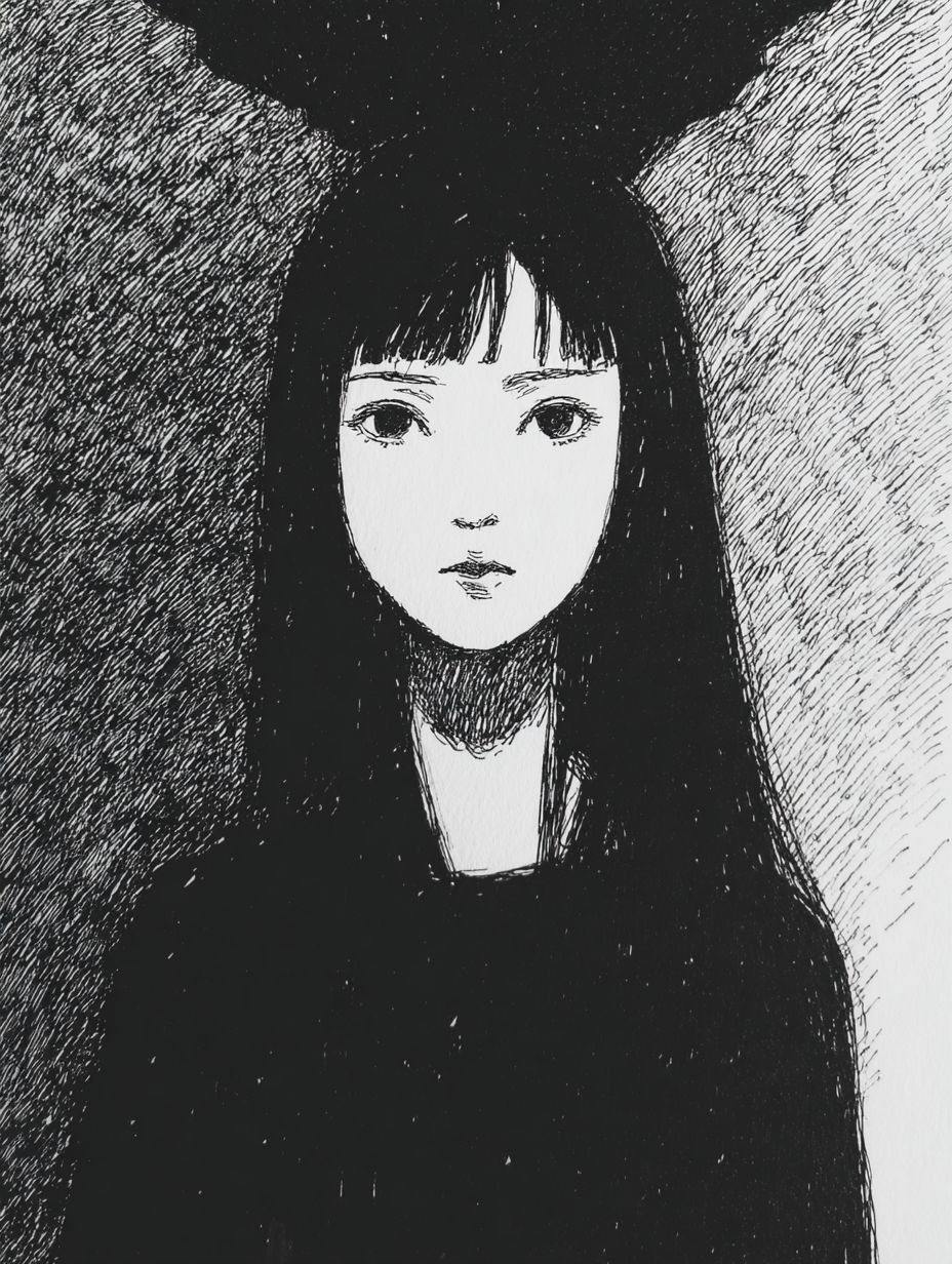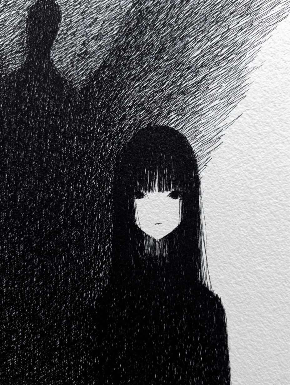一個留著長髮和劉海的女孩,穿著黑色衣服,風格像是在伊藤潤二的作品中,站在天使的陰影下,墨水畫,簡單的背景,簡單的線條,手繪的感覺,粗略的草圖,白紙上,面部有黑色鉛筆畫筆痕跡,簡單的細節,簡單的顏色,陰暗的氛圍,全身照。