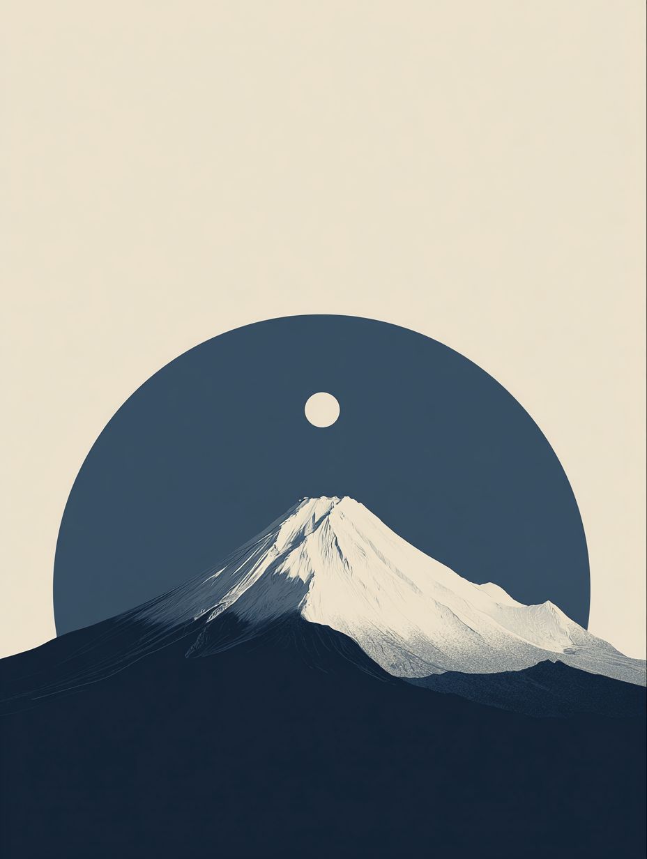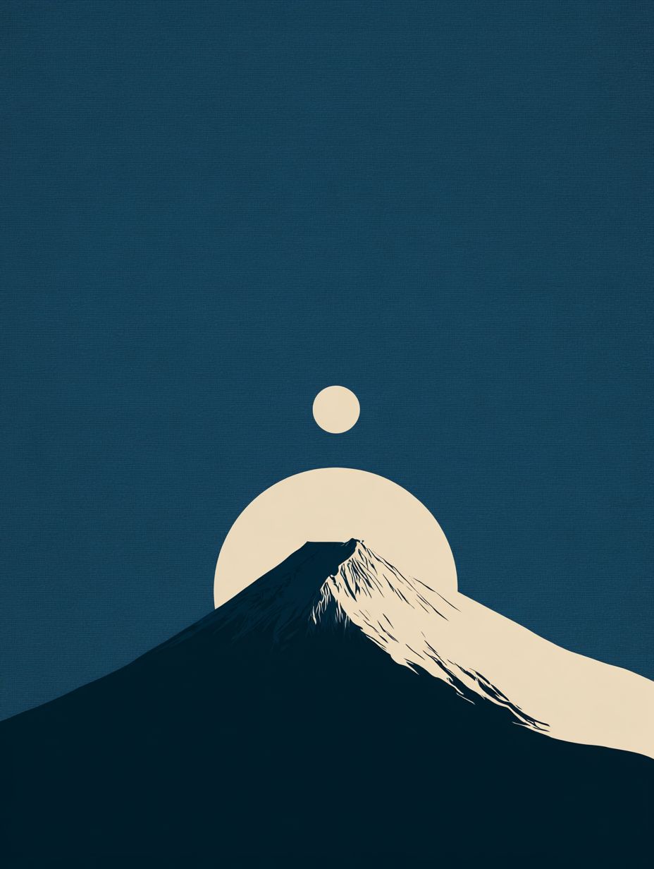 Minimalist Japanese retro art of a crescent moon rising over Mount Fuji, simple silhouette in navy and cream with a single pale moon above, tranquil and balanced design, exhibition poster aesthetic --ar 3:4 --v 7.0