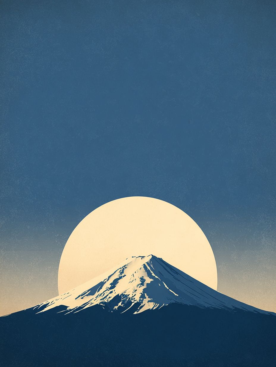 極簡日式復古藝術描繪了懸掛在富士山上的新月