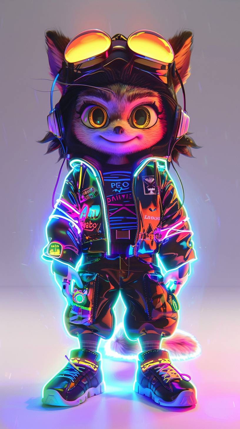 在現實世界中的照片,畫一個名叫皮科的奇比風格角色,她看起來像一隻擁有柔軟吉娃娃毛的刺蝟。皮科正面朝向觀眾,擁有大而有表現力的棕色眼睛和小巧圓潤的身體。她穿著賽博朋克風格的服裝,包括一件流線型的未來派夾克,帶有發光的霓虹線條,以及配套的褲子。她的頭上戴著高科技護目鏡。皮科的毛髮和刺針與服裝自然融合。背景應該是簡單的純色,以突出皮科的細節,包含賽博朋克的服裝和護目鏡,高分辨率圖像,完整身體,正面視圖,居中,白色背景。