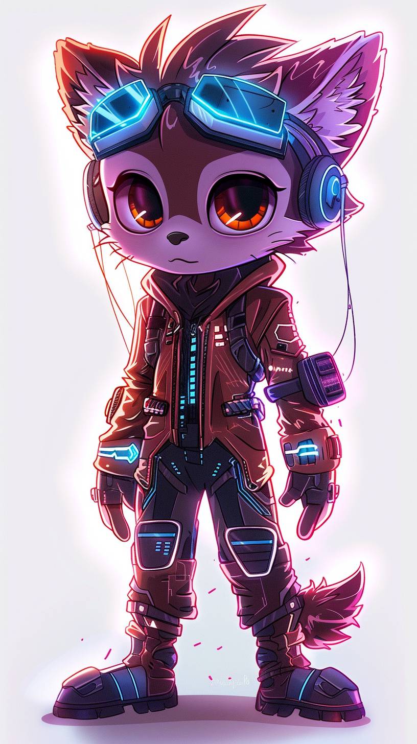 a photograph in the real world,rearism,Draw a chibi-style character named Pico, who has the appearance of a hedgehog with soft Chihuahua fur. Pico is facing forward, with large, expressive brown eyes and a small, rounded body. She is wearing a cyberpunk outfit, including a sleek, futuristic jacket with glowing neon lines, and matching pants. She has high-tech goggles on her head. Pico's fur and quills are visible, blending naturally with the outfit. The background should be a simple, solid color to emphasize Pico's details,with Cyberpunk clothing and goggles,high resolution image , full body, front view, centered, white background --ar 9:16 --v 6.0