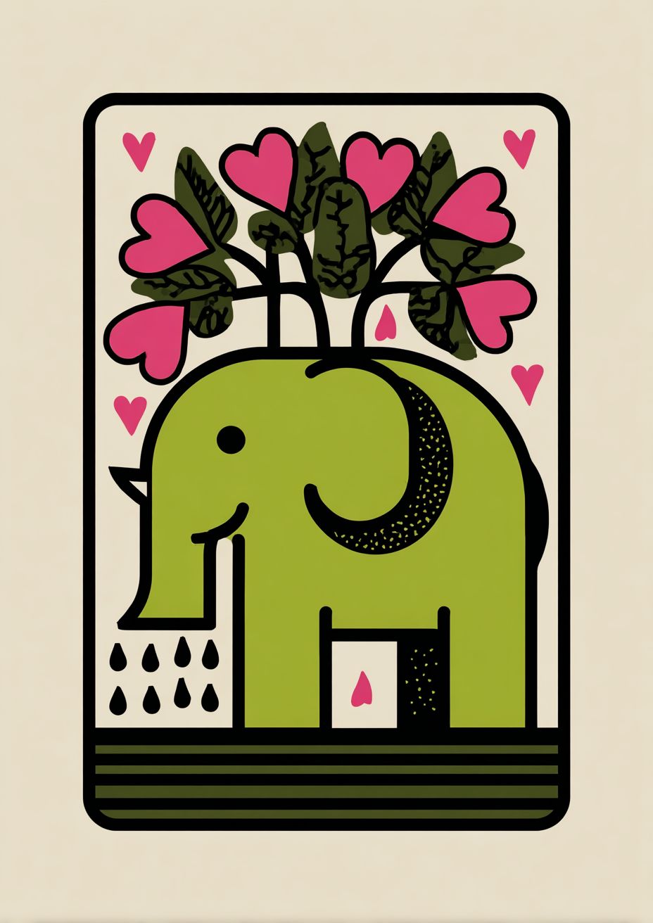 一隻青檸綠色的大象用自己的長鼻子給自己浇水,水滴是心形的粉紅色,設計採用簡單的形狀和粗線條,背景是米色的,風格類似於理查德·霍勒里斯和格爾德·阿恩茨。