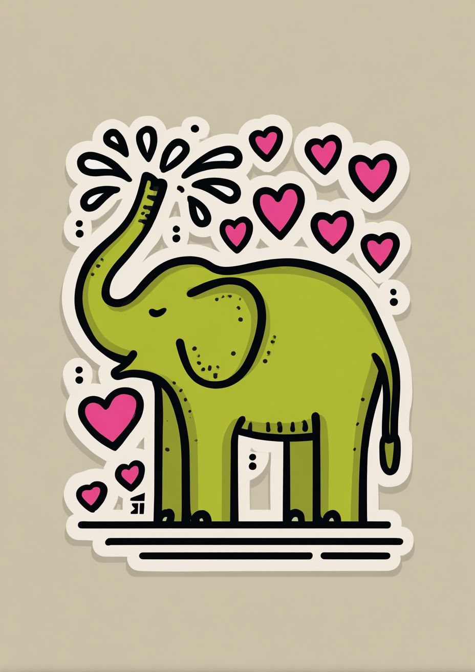 sticker design of a lime green elephant watering himself from a trunk, drops of water are heart shaped and pink, with simple shapes, bold lines, and a beige background with, in the style of richard hollerith and gerd arntz. --ar 39:55