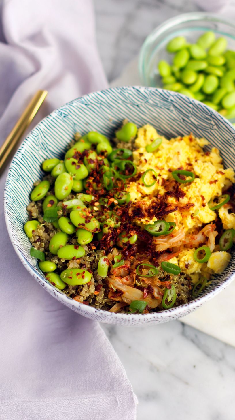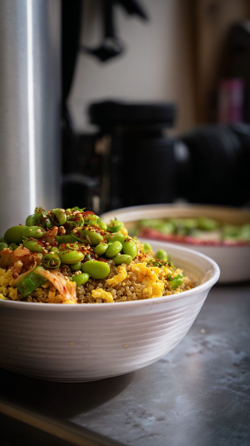 an artisanal bright kitchen scene of a quinoa bowl with scrambled eggs, chopped kimchi, sliced scallions and shelled edamame with a sprinkle of chili flakes. Taken from a distance with a professional DSLR camera taken on a kitchen counter . --ar 9:16 --stylize 0